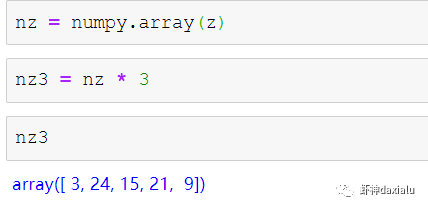 但是在Numpy里面,直接用ufunc方式来实现,直接在数组上乘以3,得到的结果是每个元素依此乘以3了: