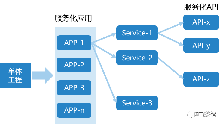 另一方面,随着业务的高速发展以及超大规模业务体量的驱动下,大部分企业引入了更为灵活的微服务架构。我们知道,微服务架构是从单体架构或分层架构演进而来的,从一个单体工程拆分出n个独立模块,如下图所示: