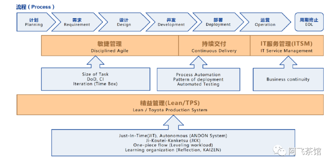 从很多企业成功了应用了Agile、Scrum和XP等方法论,即使提高了开发效率,但对业务速度提升还是觉得远远不够,原因在于:表面上看起来是开发过程的瓶颈,但在调查中发现开发过程并非瓶颈,相反是业务流程应该被改进。所以我们应该从业务的目标出发,度量并改进和优化端到端的业务流程,比如:提高系统发布频率、降低发布失败率。