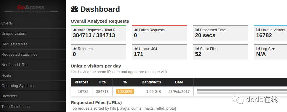 go-access是以docker容器的形式运行的,只要你安装了docker,就能直接运行,免安装很方便。以上脚本,配合日志每天的日志分割,然后在crontab里面配置一下自动运行脚本,可生成每一天的nginx报表,网站情况一幕了然。
