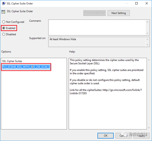 b. Edit setting: ComputerConfiguration -> Administrative Templates -> Network -> SSLConfiguration Settings -> SSL Cipher Suite Order.