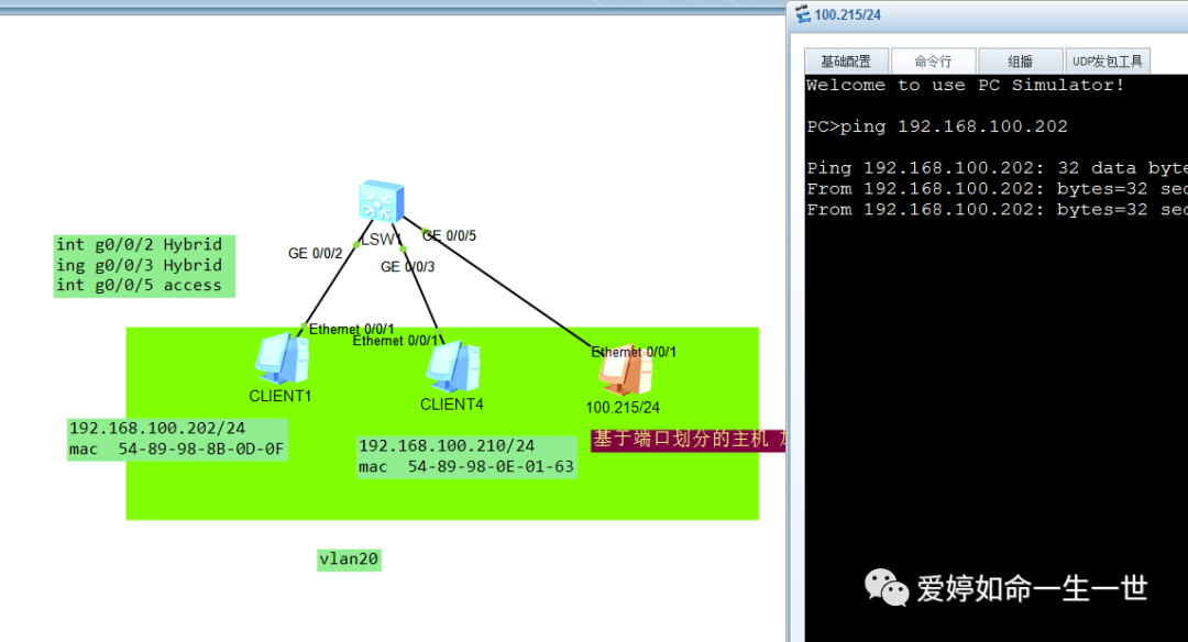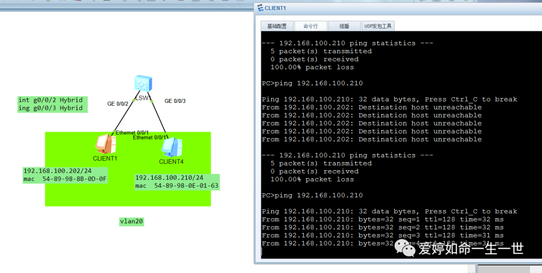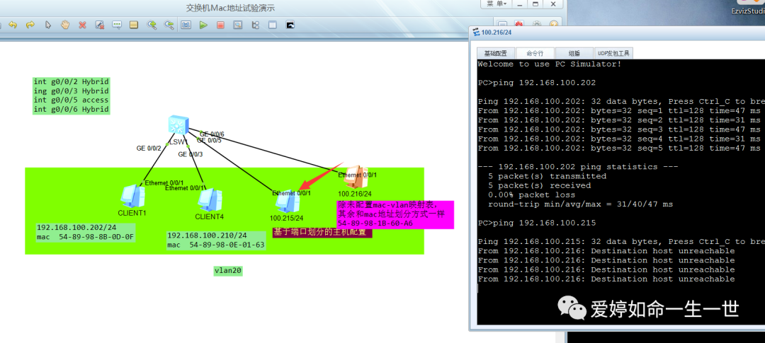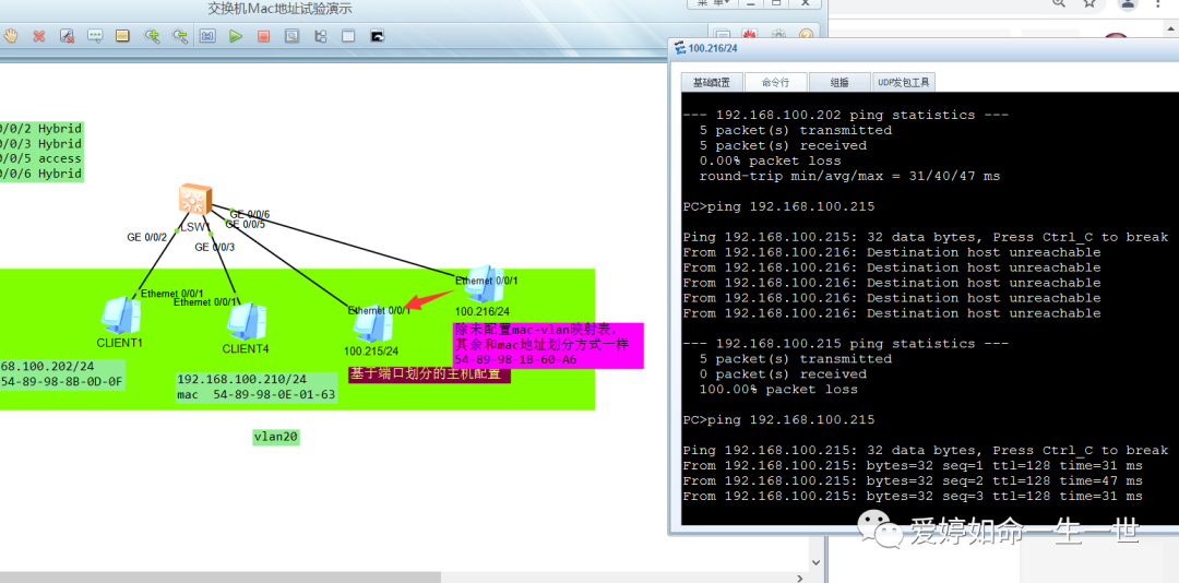 拓扑中,一台基于mac地址划分的主机(只是没有添加vlan_mac映射表)去和一个基于端口划分的主机进行通讯,结果显示:两者不能正常通讯