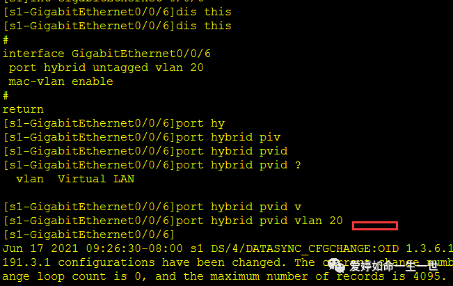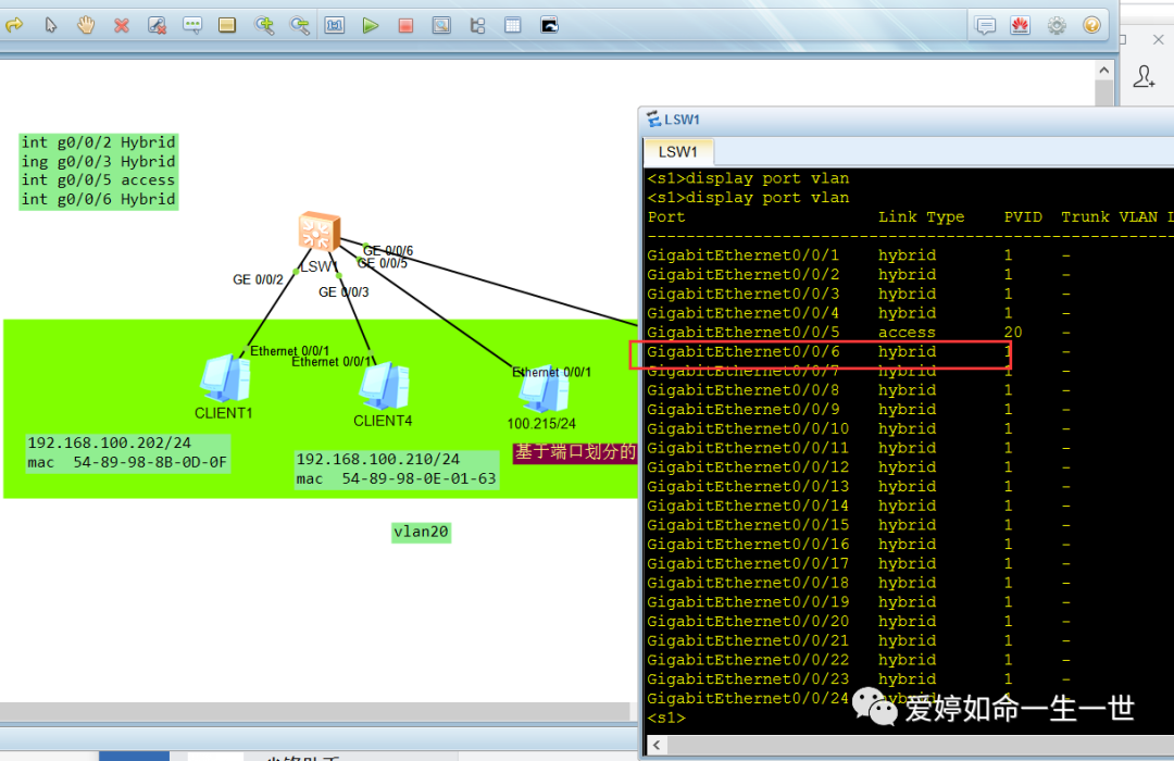 那么若是将216的主机的6号端口PVID改为20,它和主机1就能够正常通讯了。[s1-GigabitEthernet0/0/6]port hybrid pvid vlan 20