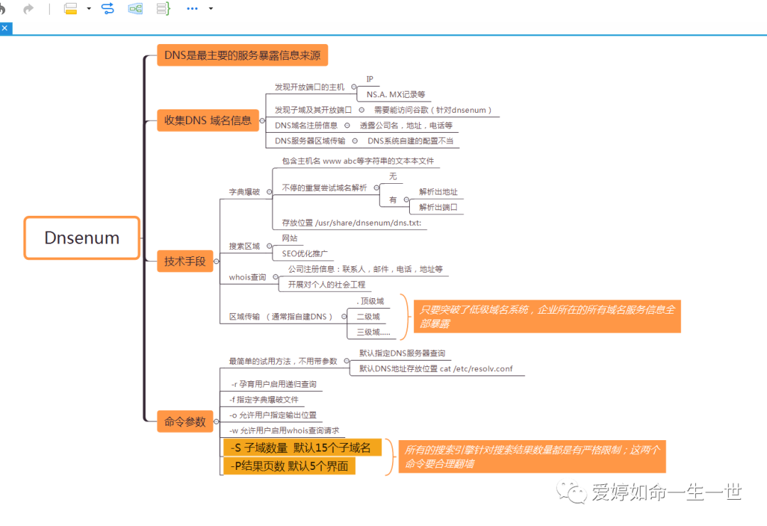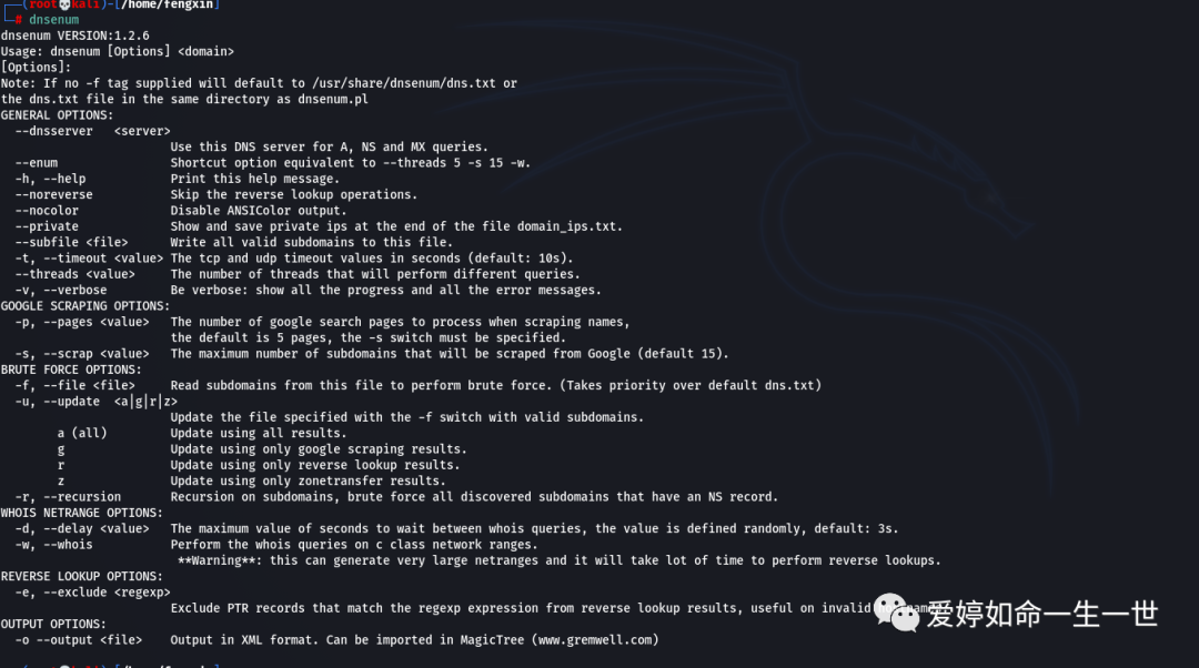 DNSenum 是一款非常强大域名收集工具。它能够通过谷歌或者字典文件猜测可能存在的域名,并对一个网段进行反向侦查。