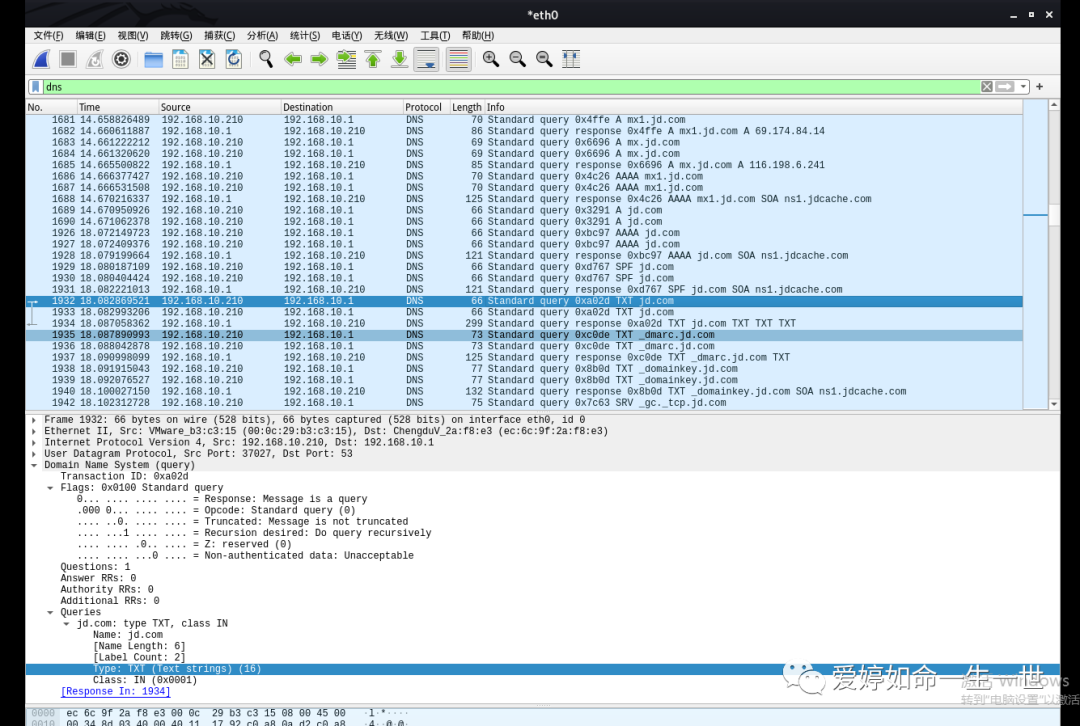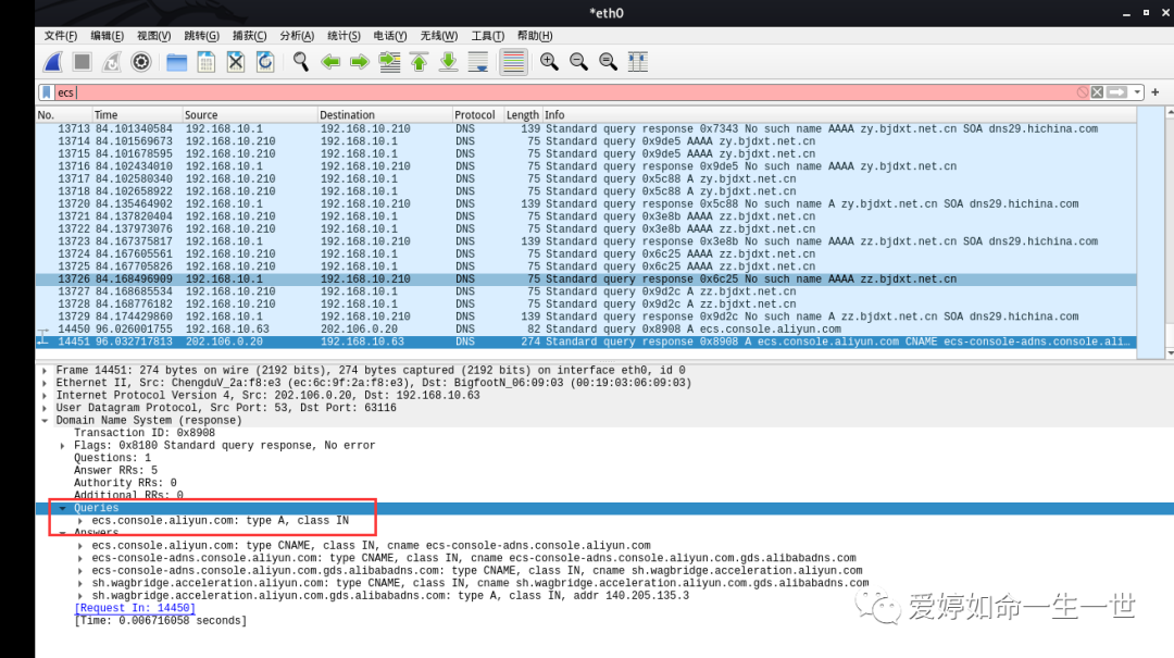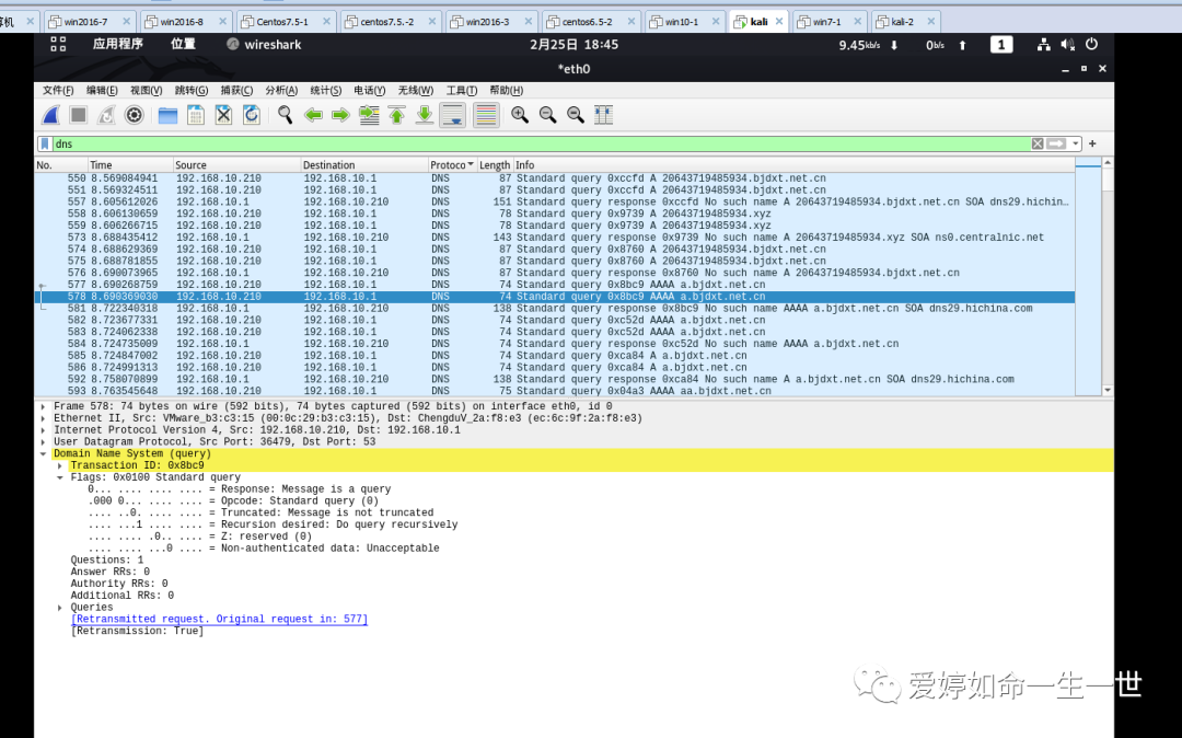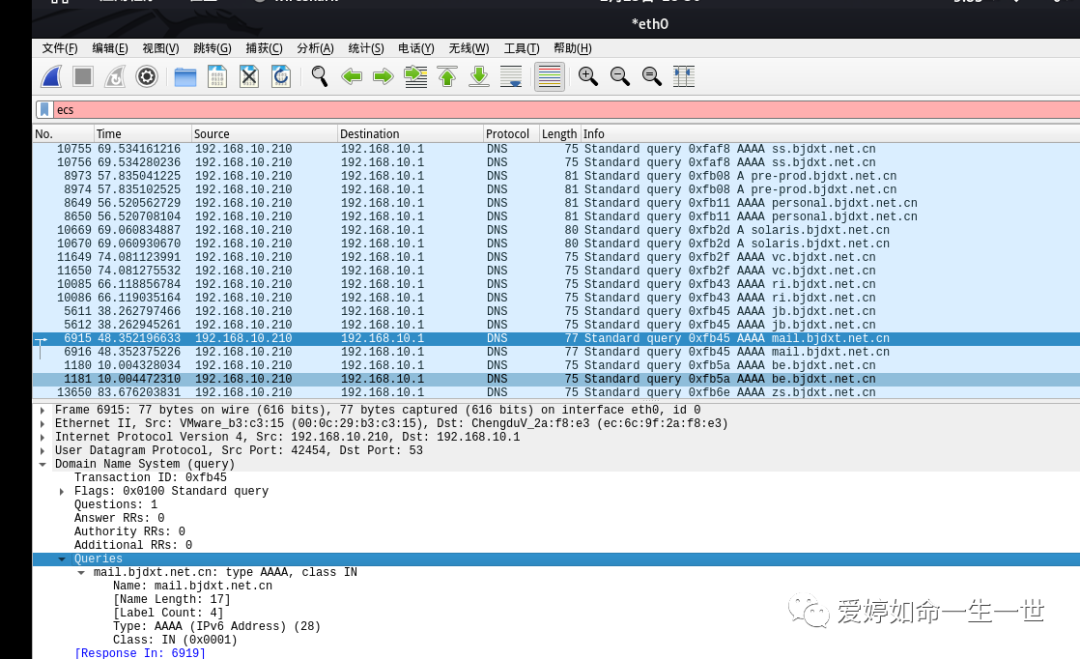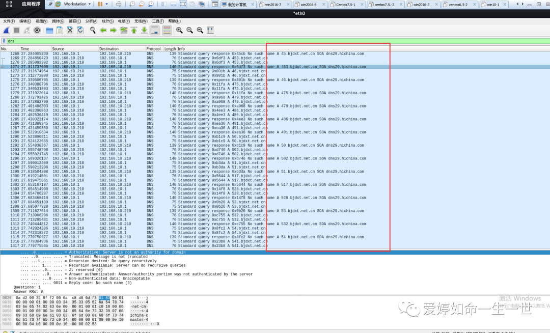 在查询的同时,网络抓包可以看到主机向互联网中DNS服务查询动作(爆破动作不停的去查询)