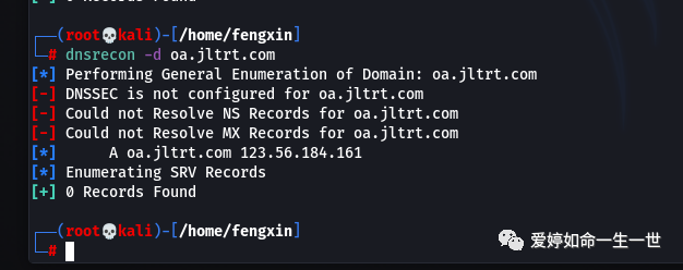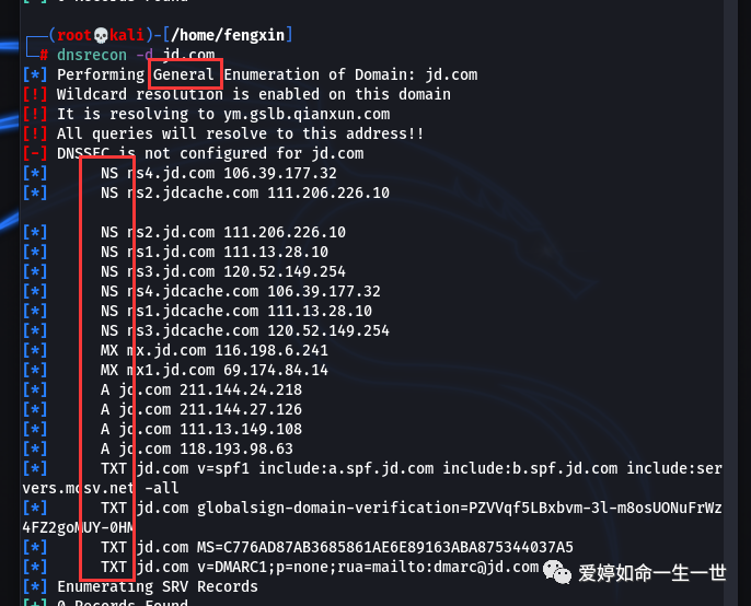 因为没加任何命令参数,图中执行了一个General(标准)的枚举过程,可以看到解析的记录类型,有域名服务器记录,主机,反垃圾邮件几率等