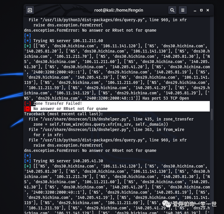-a就是把所有解析出来的域名记录(NS)一一找出后,axfr区域传输比对,找出他们任何一台是否有抖动,可惜,阿里云的域名服务器怎么可能有漏洞呢?