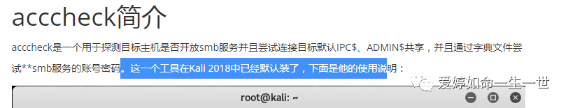 这就导致了,在后期试验中,我无法展现accchek这个工具对SMB协议破解共享文件的试验演示,其实acccheck这个工具,功能很单一,就是破解,只不过我想演示的是通过acccheck工具来破解SMB协议中端口中的共享文件密码!(我专门花时间安装了2017-2019版本的kali liunx系统,下载了所有的工具,也是不能找到这个工具!)
