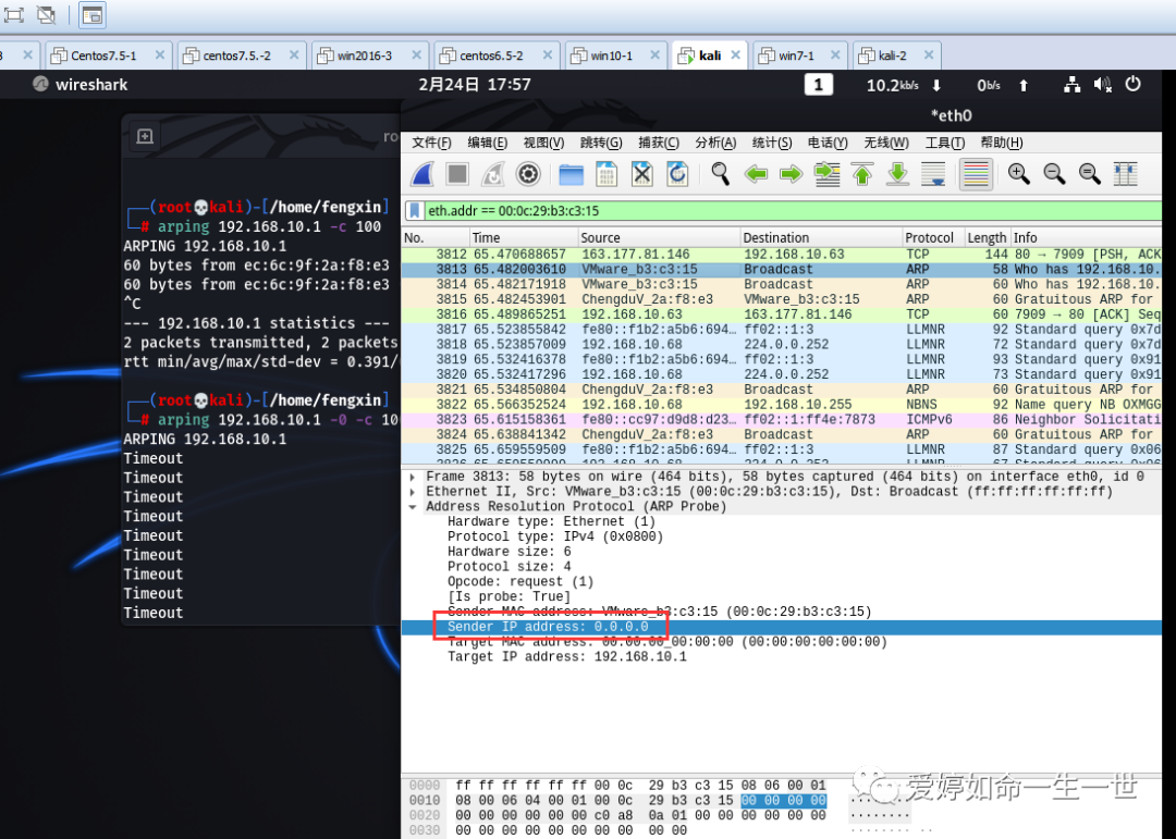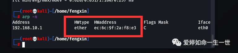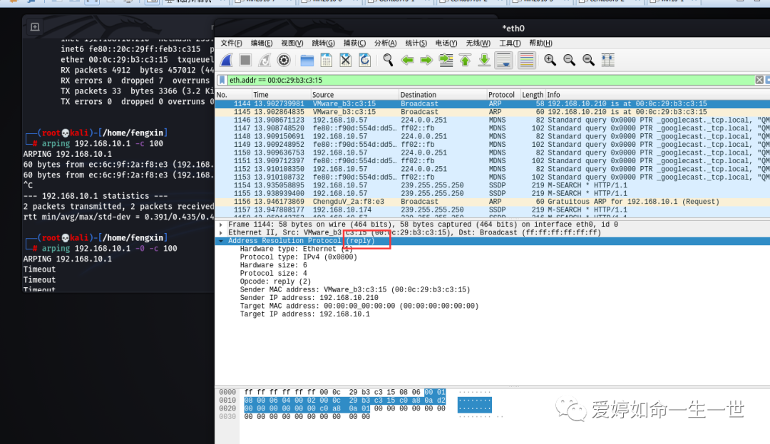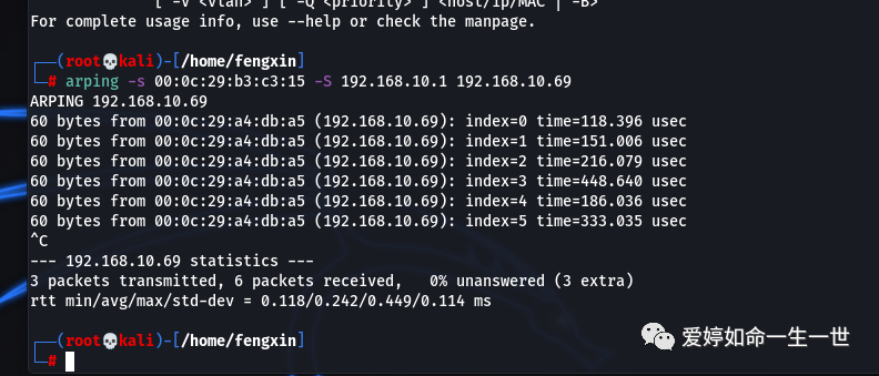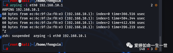 在系统中开始arping的动作。└─# arping -i eth0 192.168.10.1 -C 100