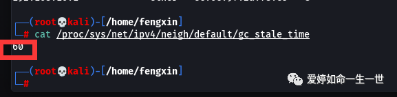 并且可在kali系统中查看arp缓存时间为60秒;也可以修改时间