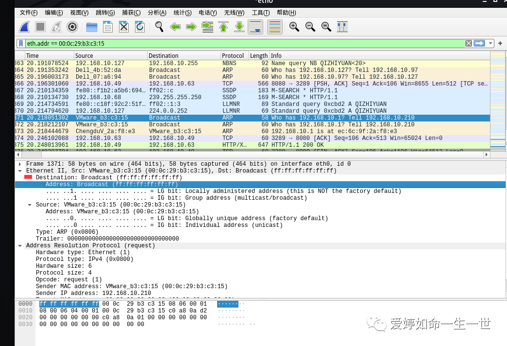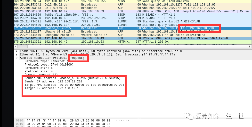 能看出这是一个arp的请求报文,源IP源mac地址;目标mac地址全为0