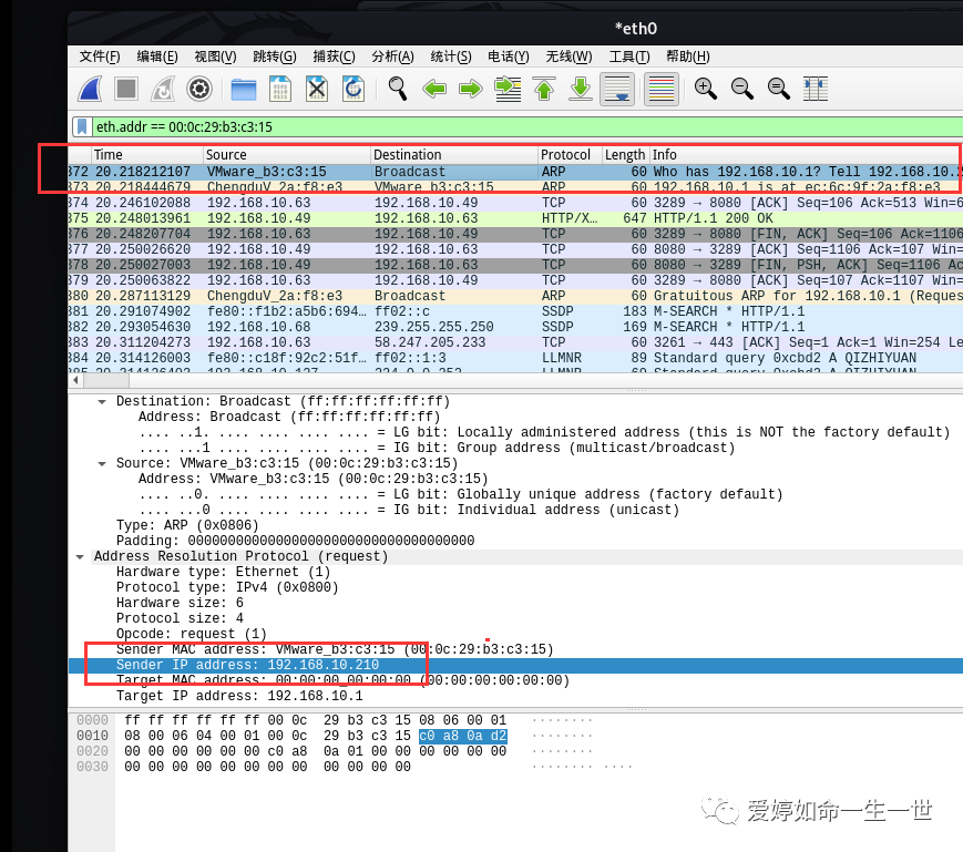 利用筛选器的命令,筛选的系统中网卡的mac地址,看到arp报文中源ip的被变为了 00000000