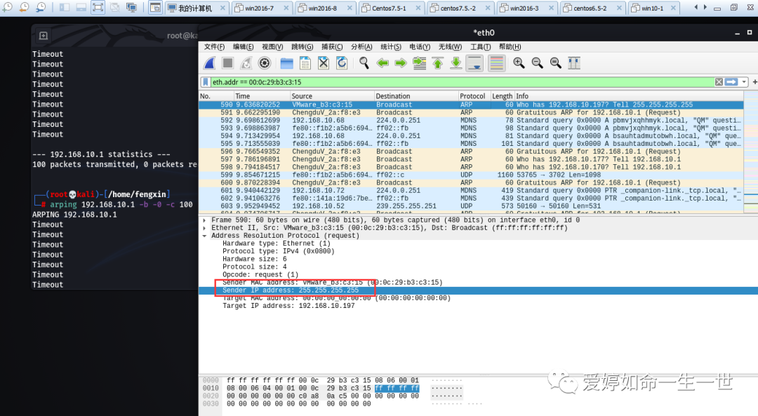 如图所示:正如理论所说,-b修改了arp报文中源ip地址,虽然不能通讯但是达到了想要的结果,不通的原因原因在于arp报文只有一个request请求报文,这代表了网关设备拒绝了源IP为255的IP地址!