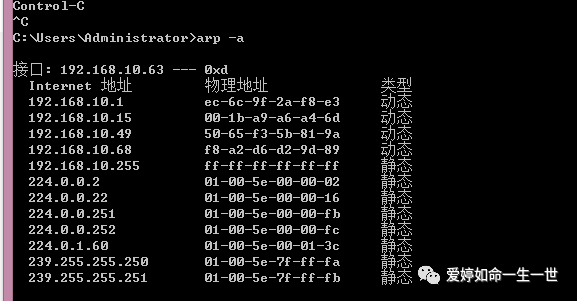 可以看到我的主机就有了arp映射关系,在Windows中,arp缓存时间为2分钟;