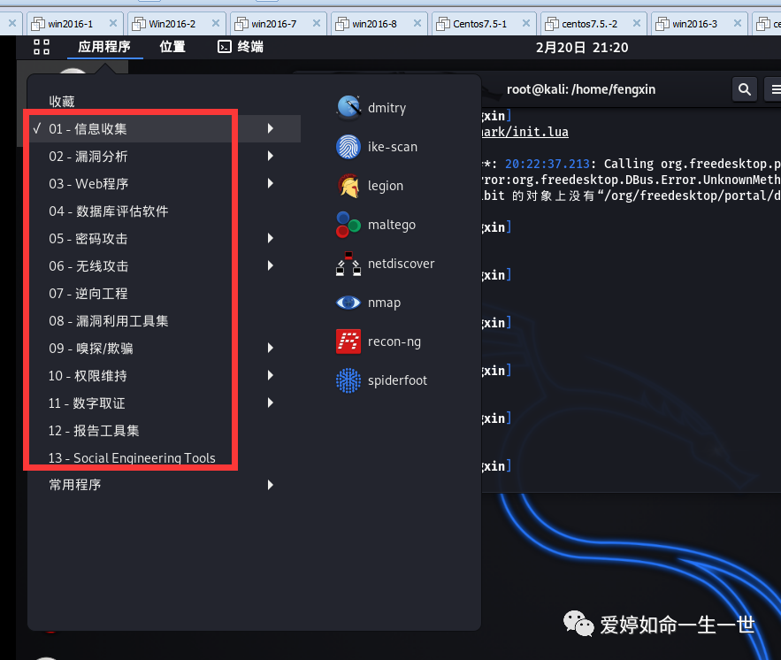 在kali linux系统中,针对工具的应用有13种类型,如图所示: