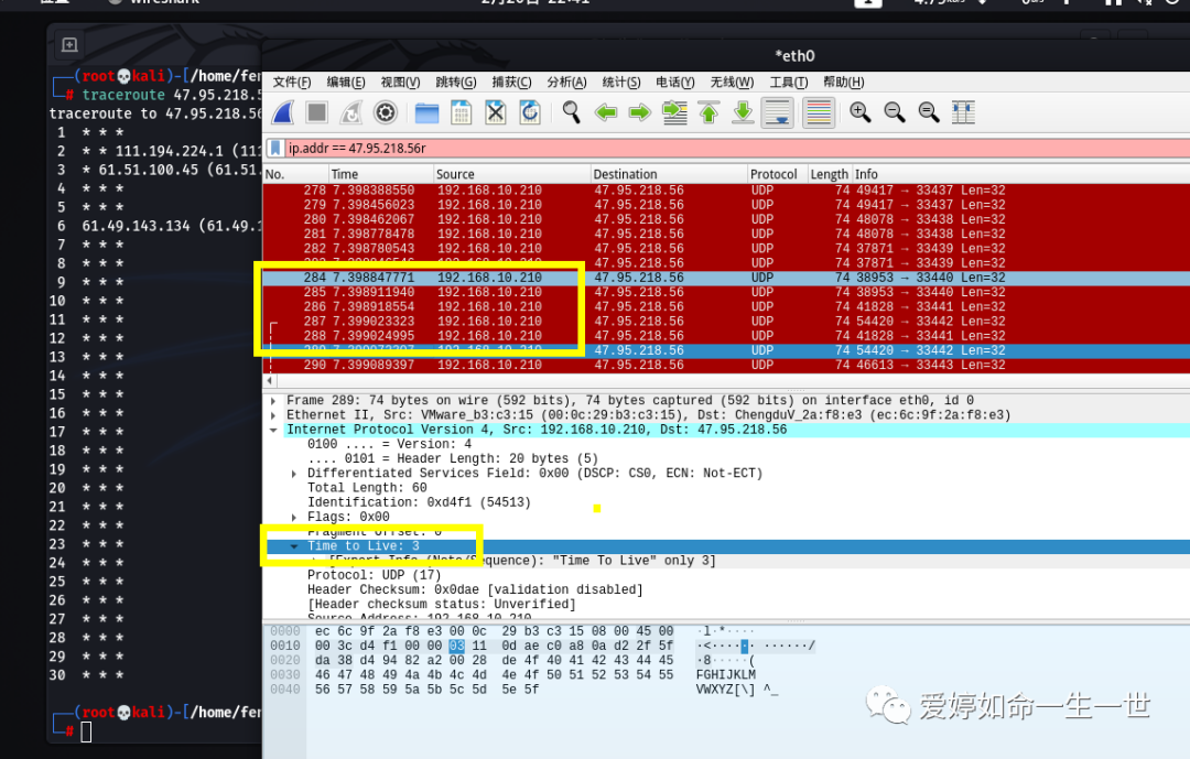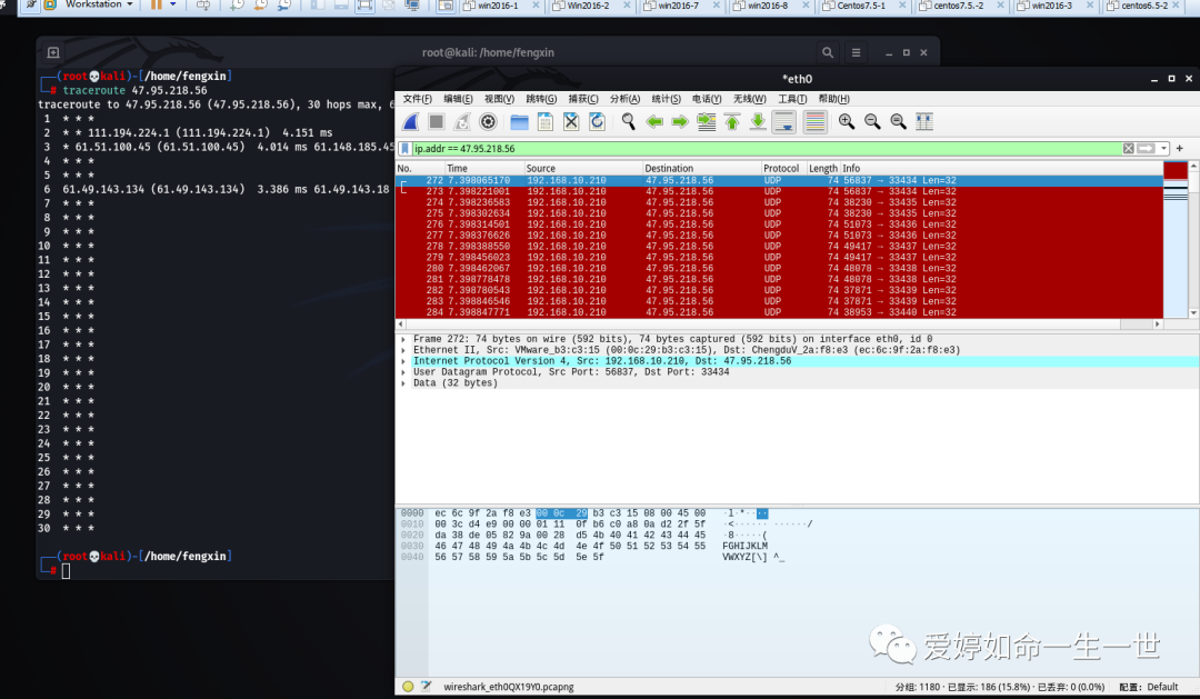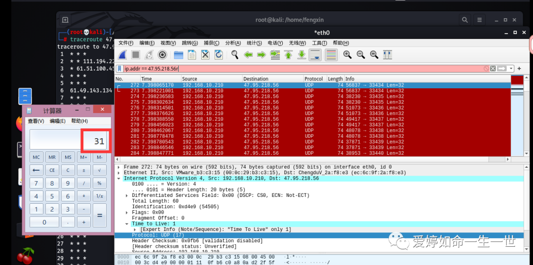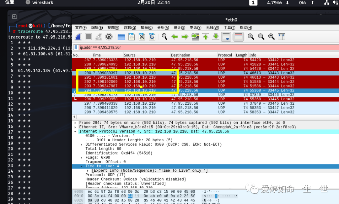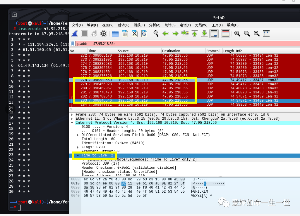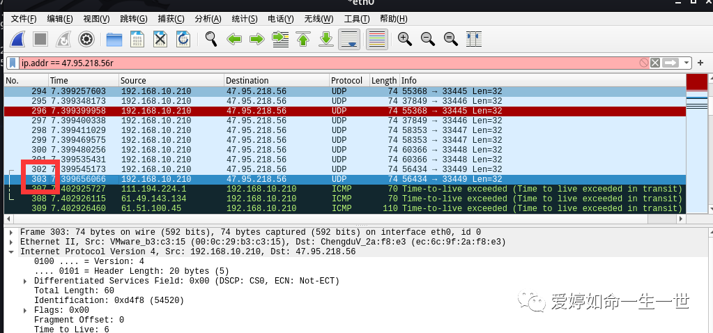 抓包得来的结果是UDP协议的报文,和我想象的应该是ICMP报文大相径庭!