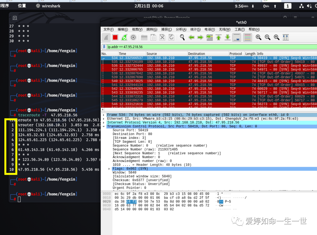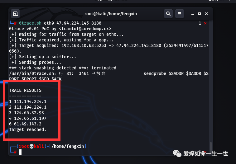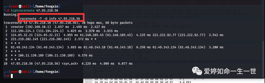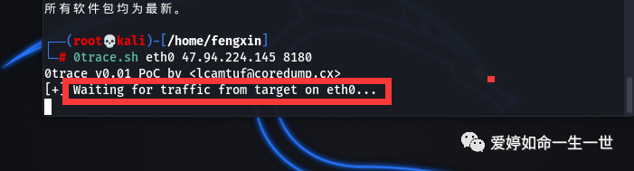 这条命令不同的是,0trace他是一个Linux脚本,命令书写上会有不同,shell脚本跟上本地网卡+目标IP地址或者端口,不加端口也是可以的,只要建立端口连接就可以了!