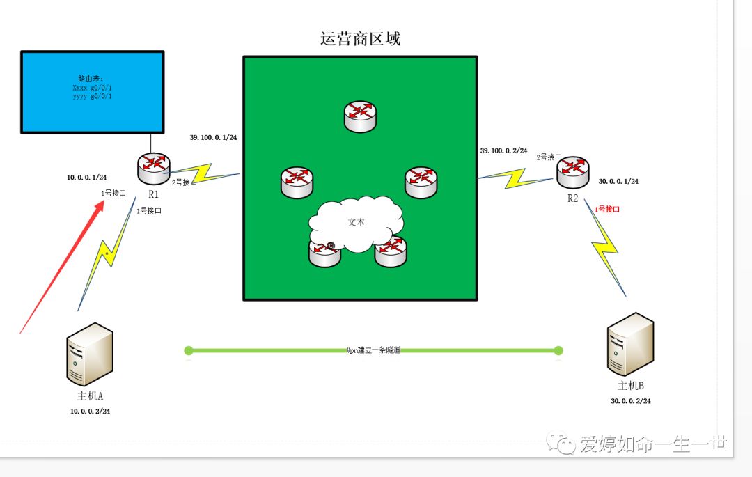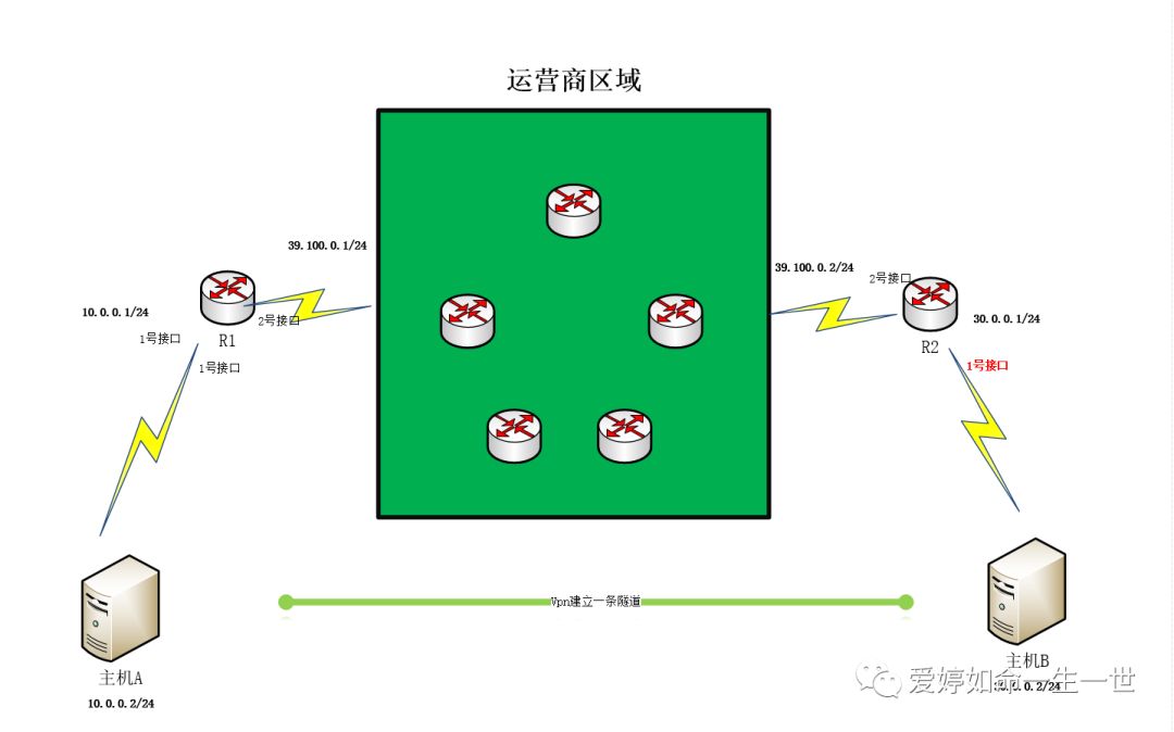 如图所示:抛开NAT转发技术,部署VPN首先会建立一条“隧道”!当来自主机A的数据进入R1路由器的1号接口。