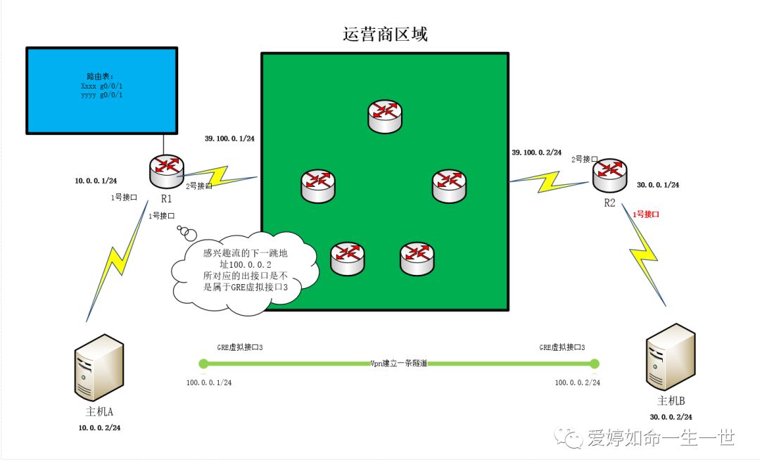 GRE配置完成后,当来自主机A的数据进入R1路由器的1号接口,网络在全部通畅的前提下,IP报文的头部一定是30.0.0.2。R1路由器接到主机A的数据,首先一定是取出数据报文中的IP地址,进行匹配路由表,从而进行是否转发!!即使你GRE配置完成,隧道建立成功!按照路由器的工作原理,R1也不会查看GRE的配置,还是按照路由表的转发寻找出接口!因此,我们可以认为路由器不会对所有的流量进行封装GRE,要对感兴趣流进行封装!缺省情况下,路由设备会对进入的流量进行判断是否加密封装!