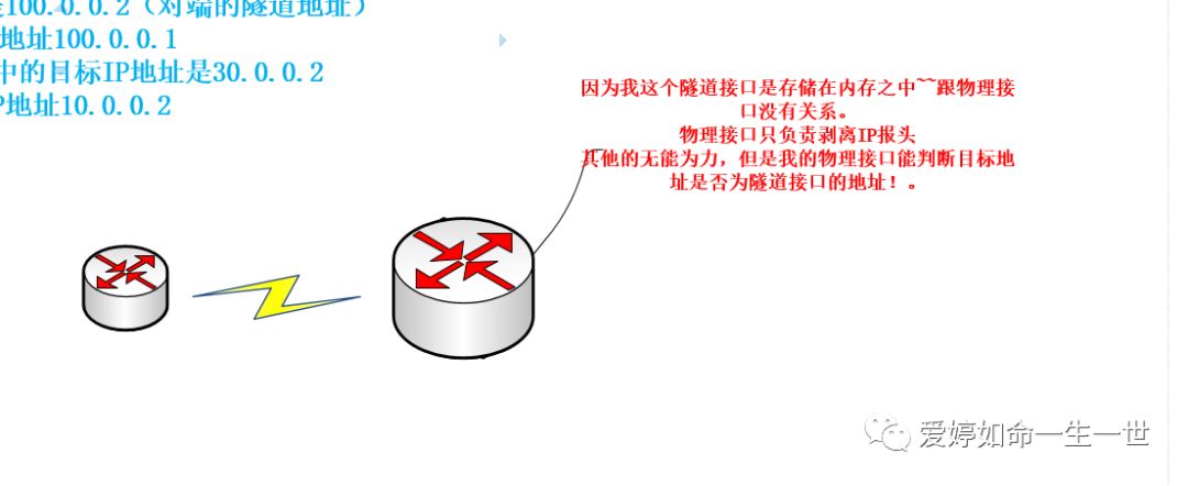 在路由设备解封掉最外层的运输协议,最终得到原始的协议报文,对其露出的原始报文(这里的原始报文指的封装协议和乘客协议,即GRE协议和IP报文)查看目标地址,如果是自己的Tunnel接口,路由设备就会判断出这个报文是否为GRE封装,最后对原始数据进行后续的转发处理。