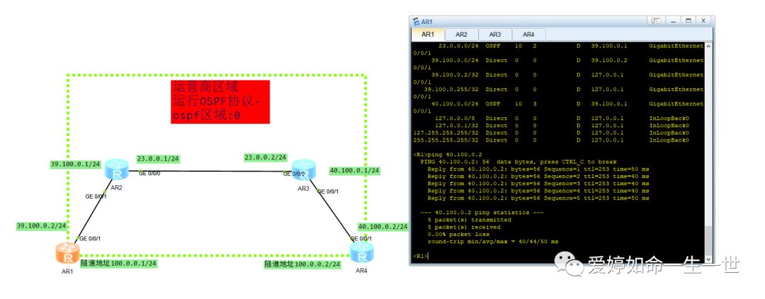 如图所示:测试R1 ping 40.100.0.2这个地址, 实现全网互通!