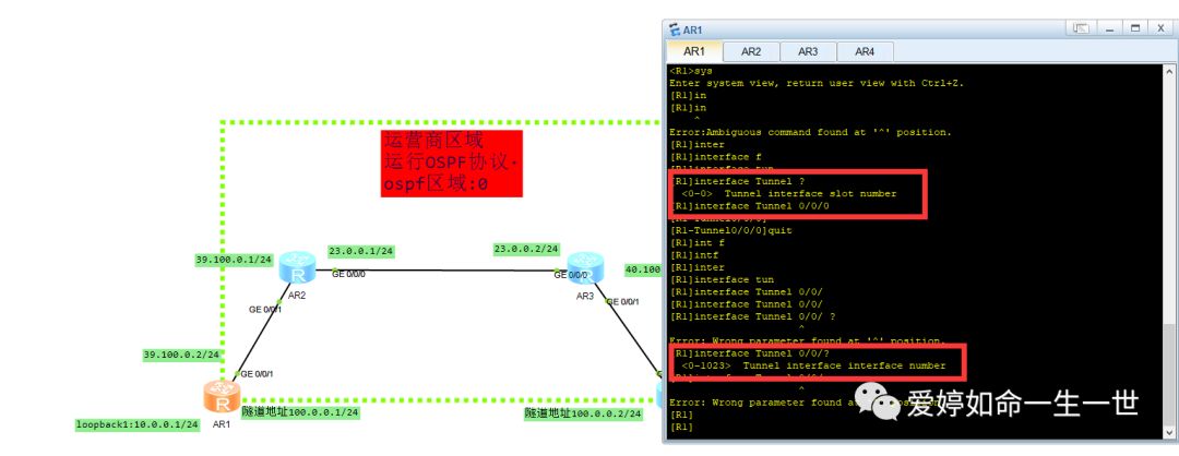 在ENSP模拟器中路由设备有三个接口板槽,可以取值为0-1023个虚拟接口,跟设备的物理接口没有任何关系,这里我取0/0/0,在实际的生产环境中,配置的虚拟接口建议成对配置,这里我R1和R2的Tunnel接口都是0/0/0