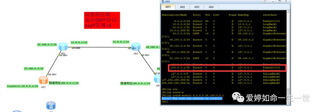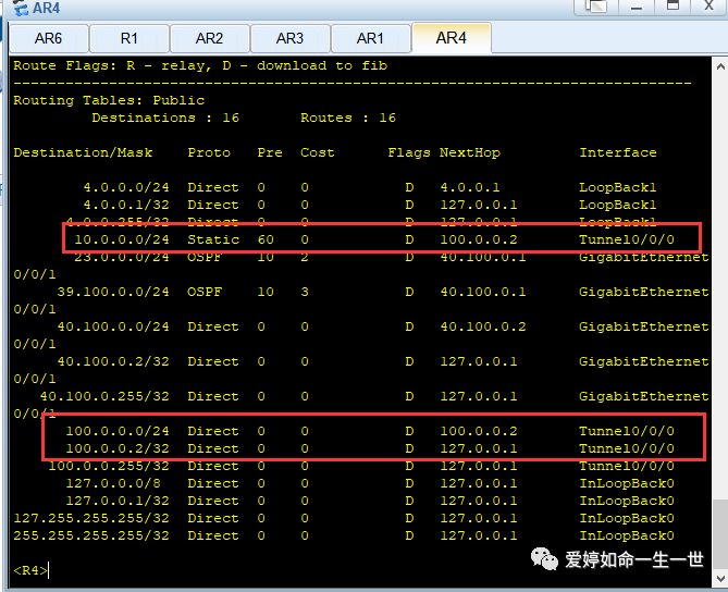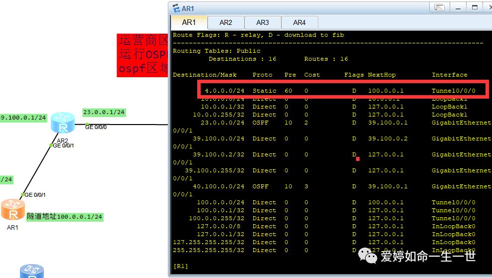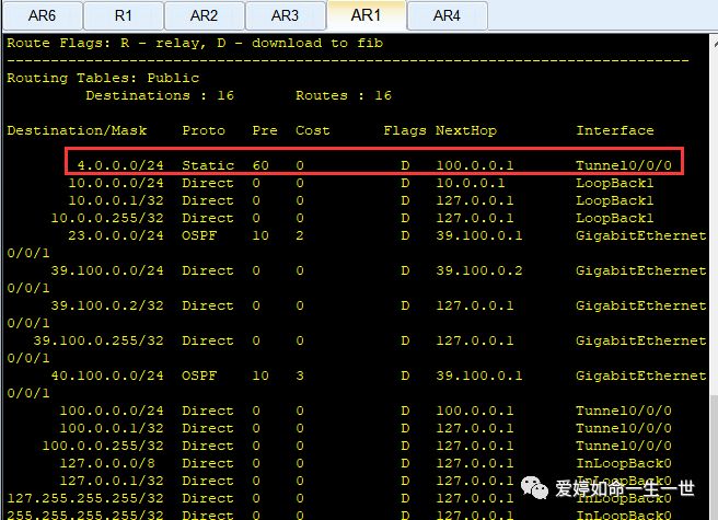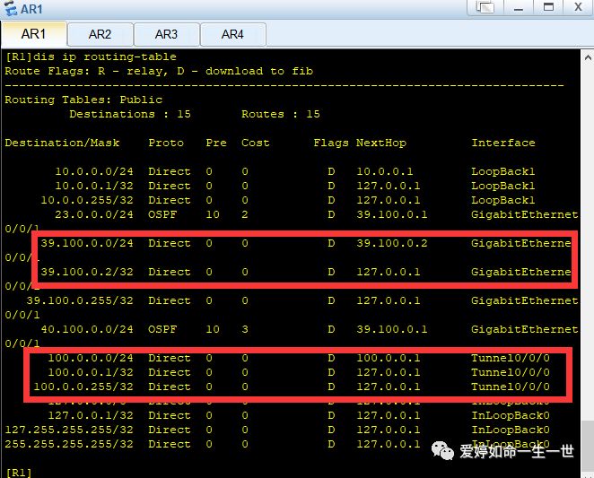 查看R1路由表:在路由表中,100.0.0.0出现在了路由表中,对应的接口是Tunnel0/0/0,39.100.0.0对应的是物理接口。