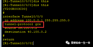 因此,R1设备收到目标地址为4.0.0.0的数据报文,R1就会将此报文按照路由转发到Tunnel接口之中,而Tunnel 0/0/0这个接口地址被我配置成了100.0.0.1/24,这样就和隧道地址对应上!