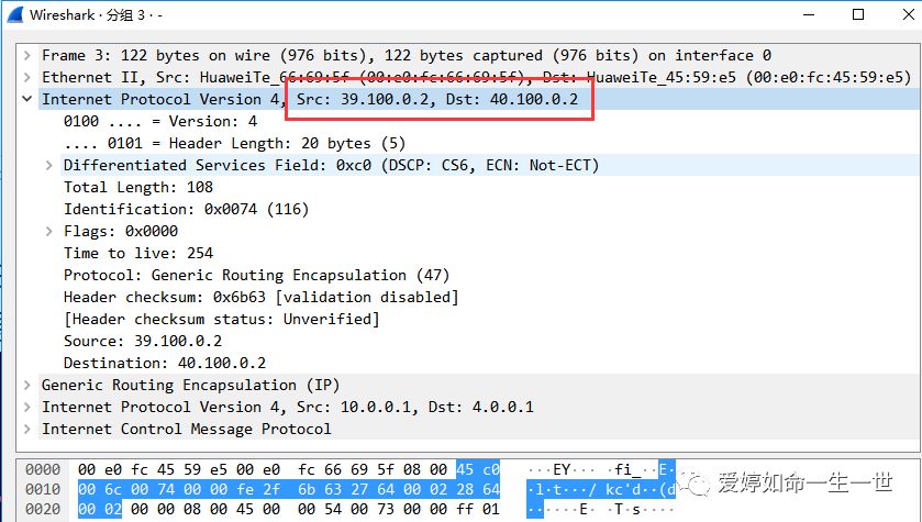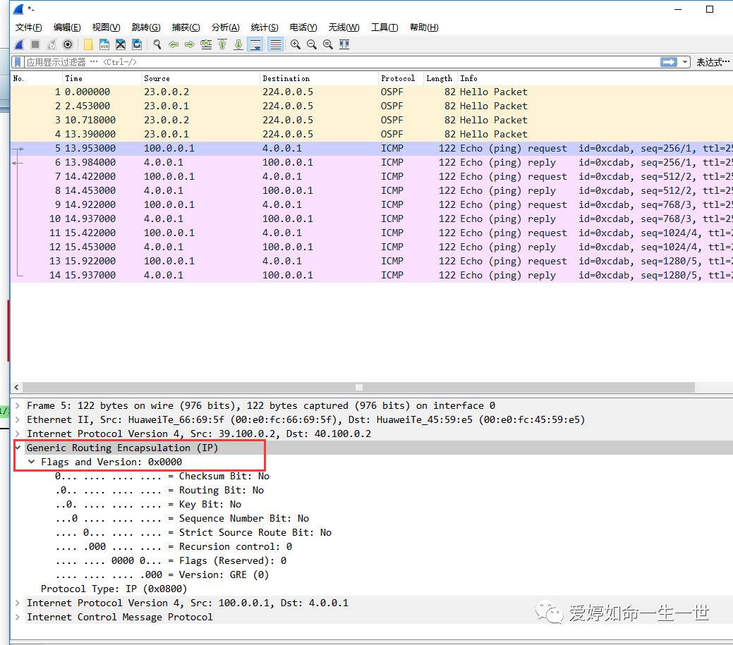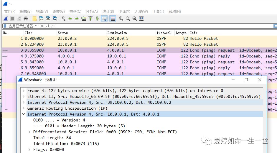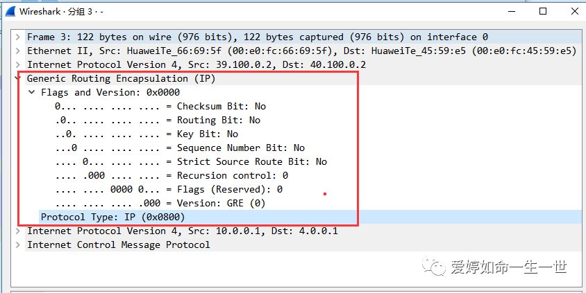 不管怎样封装,IP报文的头部不会变,解封装后查看IP报文头部的目标IP地址是自己虚拟接口的地址!就可认为这是封装了GRE协议的报文流量。