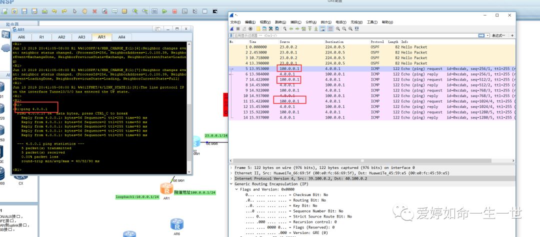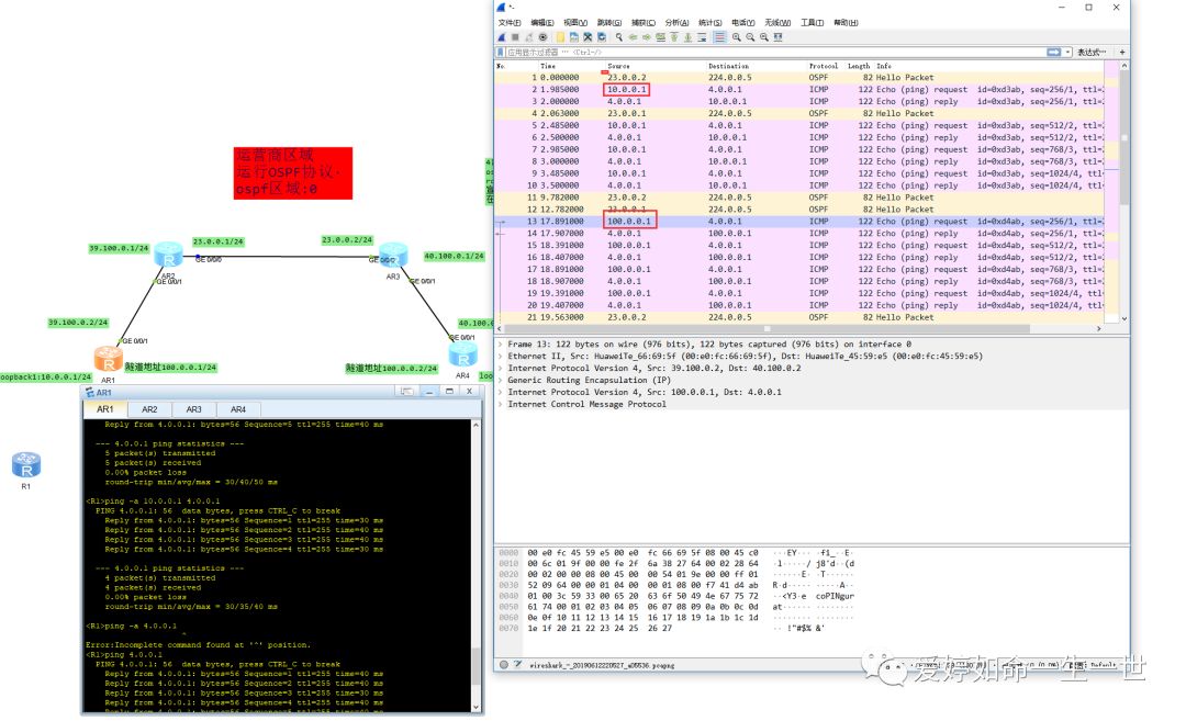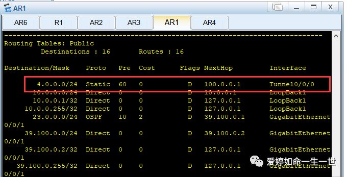 学到这个环节的时候,我天真的认为源地址一定是R1的出接口地址--39.100.0.2,查看R1的路由表发现去往4.0.0.0的路由条目的接口是tunnel接口,也就是说,站在R1上 Ping 4.0.0.0的报文是从tunnel 0/0/0接口发出的,所以源地址是100.0.0.1!