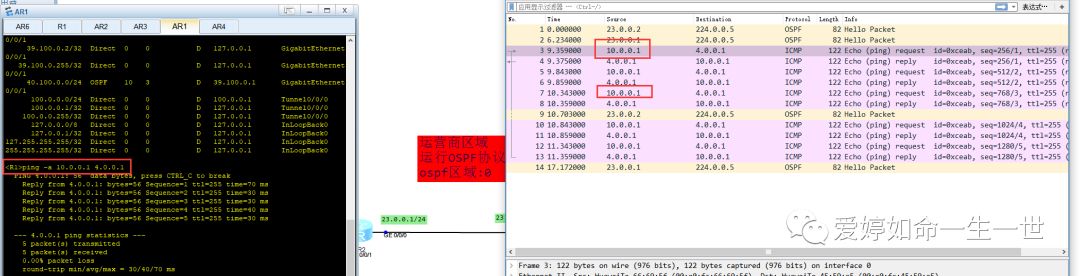 R1上ping 4.0.0.1,我们指定源地址10.0.0.1,目标地址是4.0.0.1,通过抓取R2的G0/0/0接口,观察报文封装变化: