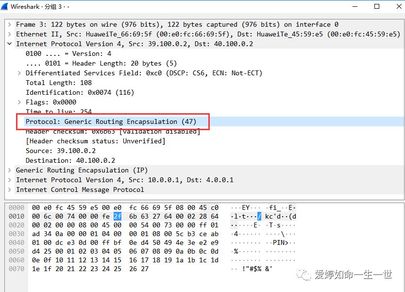 在封装过程中,可以看到封装后的GRE报文会有个新的IP头,这个新IP头部中包含了protocol字段,字段中标识了内层协议类型---47代表了GRE报文。