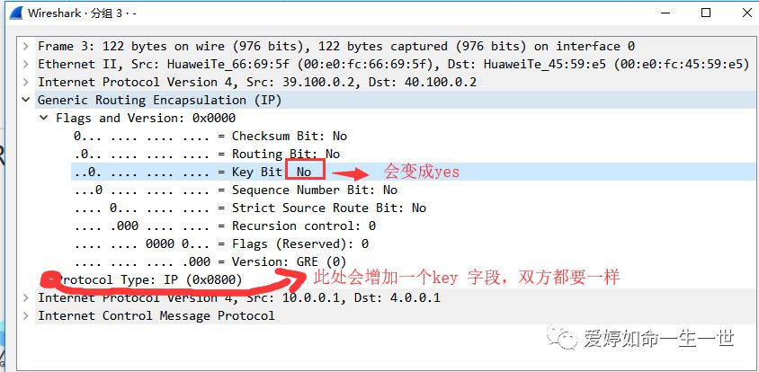 数据到达tunnel0/0/0接口后,被封装上GRE头部,通过抓包,是看不到GRE头部里有任何IP地址的,没有任何办法进行数据传输: