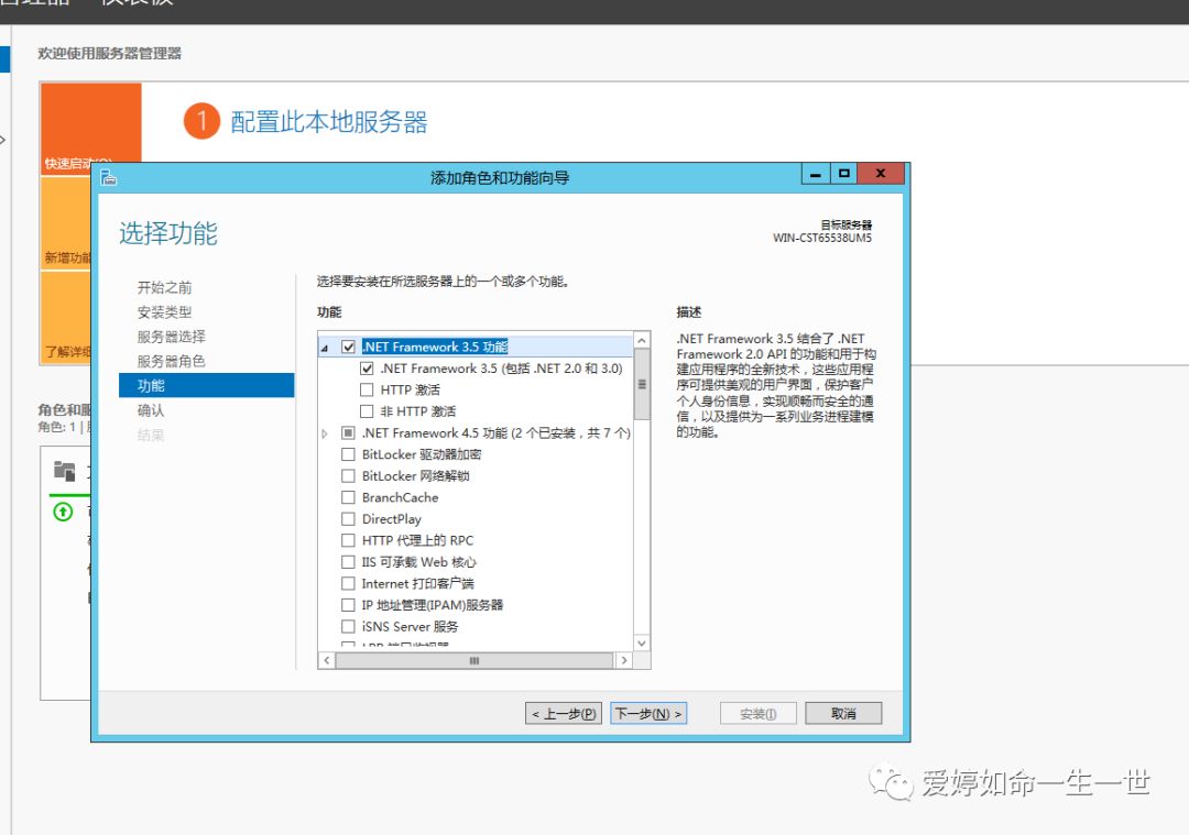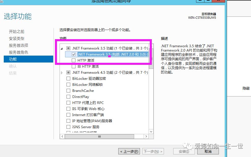 .net framework3.5的安装,在添加角色功能里,选择framework3.5,点击下一步。