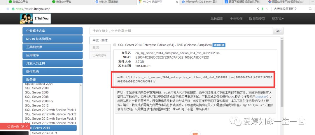 下载链接:ed2k://|file|cn_sql_server_2014_enterprise_edition_x64_dvd_3932882.iso|2898847744|A33CE10CD989083D1AD882DF0D56CFBE|/