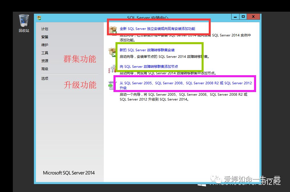 此次试验我是全新安装。需要群集和升级选择图中的标注的安装选项。