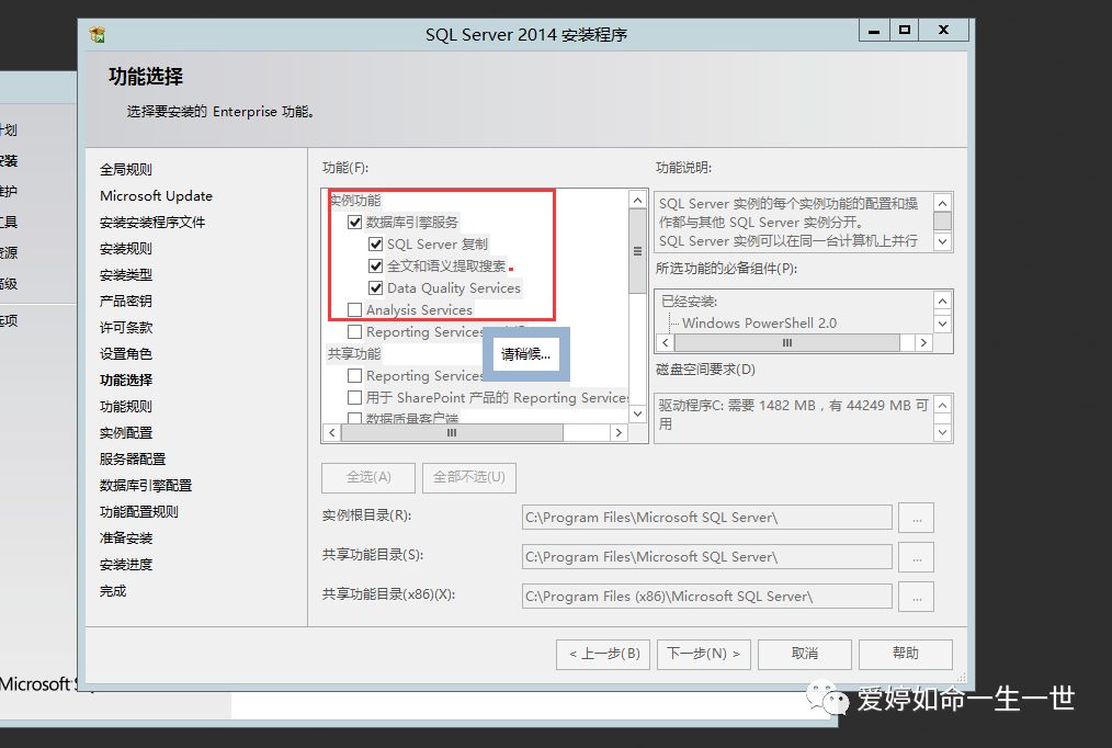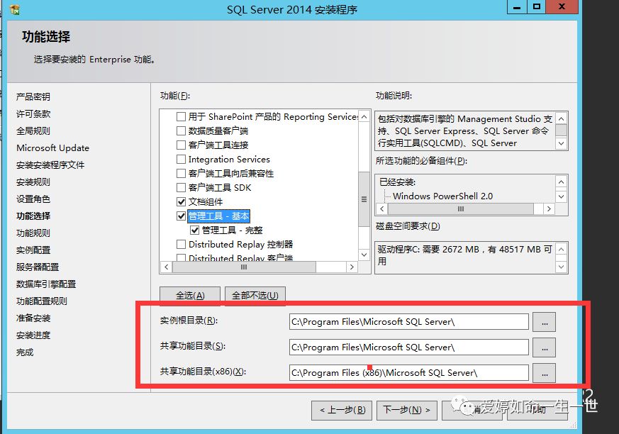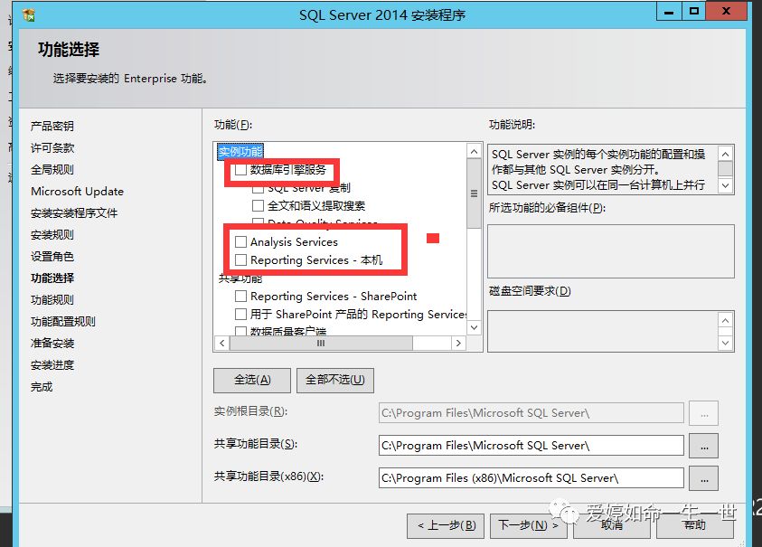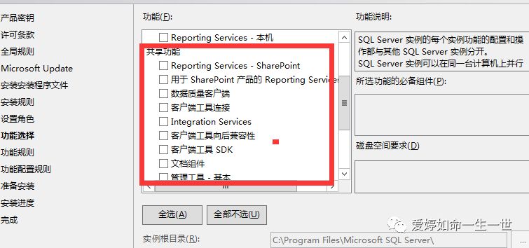 值得注意的是,在安装群集向导时,共享功能中的工具是不能选择的,因为群集功能是针对实例!