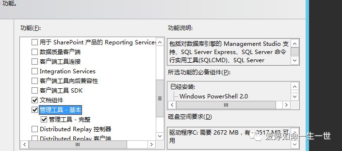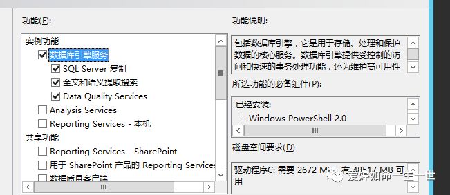 此次演示,我们安装实例功能中的数据库引擎服务、基本的管理工具、文档组件,通常情况下就足够了!