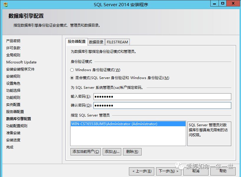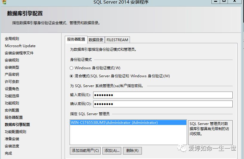 在数据库引擎配置中,配置管理员账号,这里建议选择混合模式,因为有些应用程序在数据库认证方面只认sa账户,例如OA系统。