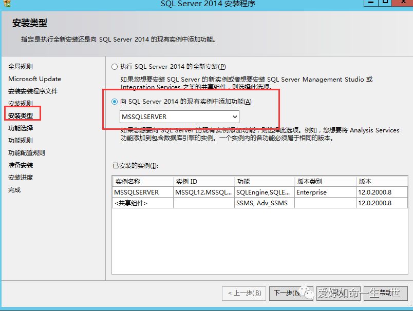 在安装类型中,如果选择现有实例添加功能,意思就是将之前的实例添加某项组件。反之,要想安装全新的实例就选定执行sql 的全新安装。这里我们点击全新安装!