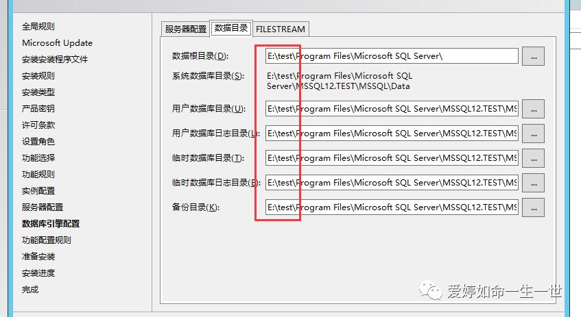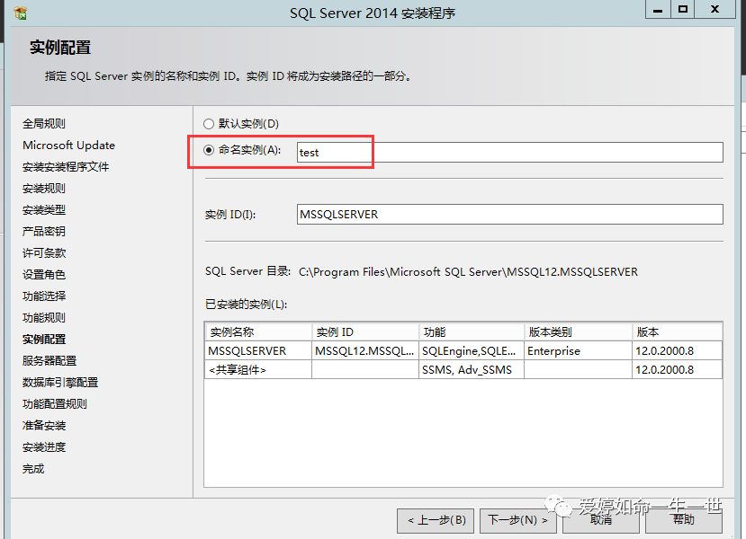 在实例配置中,定义命名实例为test。不要选择默认实例否则会报错