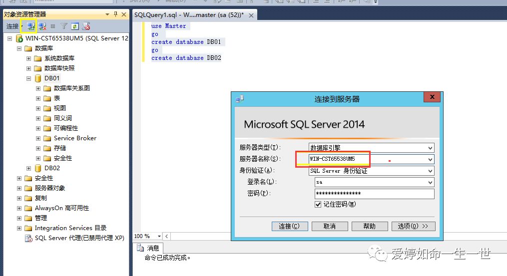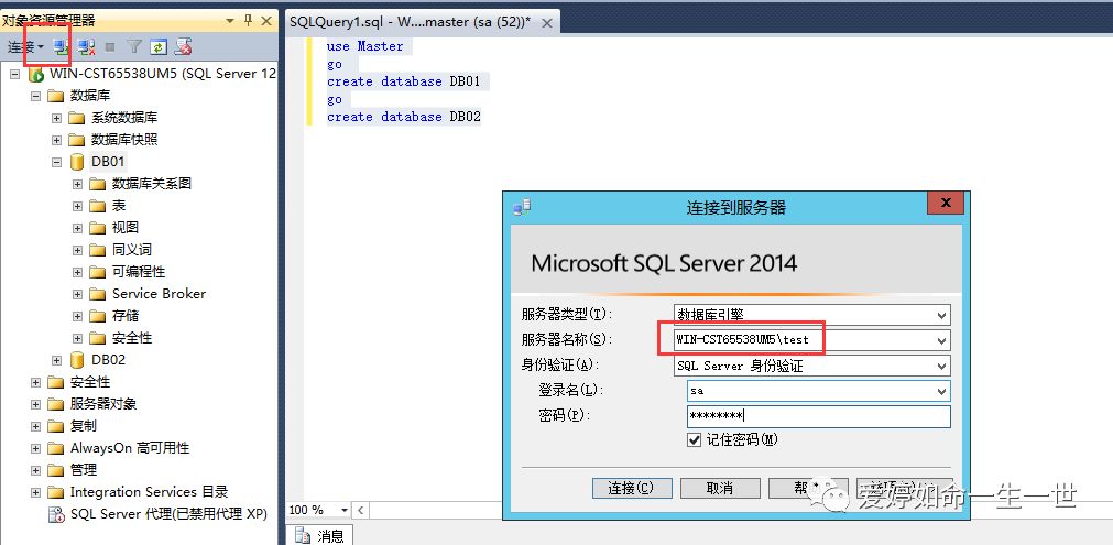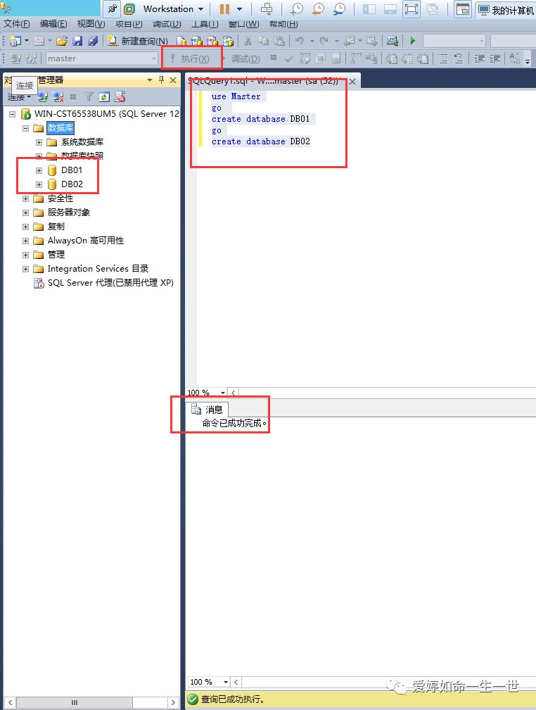 在新建查询中,我在一个实例中创建两个实例,如图所示:我执行图中的SQL语句,并刷新数据库,发现有两个我创建好的数据库,这就是一个实例中包含多个数据库!