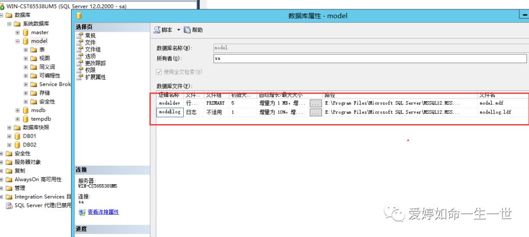 因此,在SQL定义中,在执行sql语句没有任何定义的时候,参数缺省跟model等同,如图所示:在日志文件和路径方面model的属性中有详细的标明!