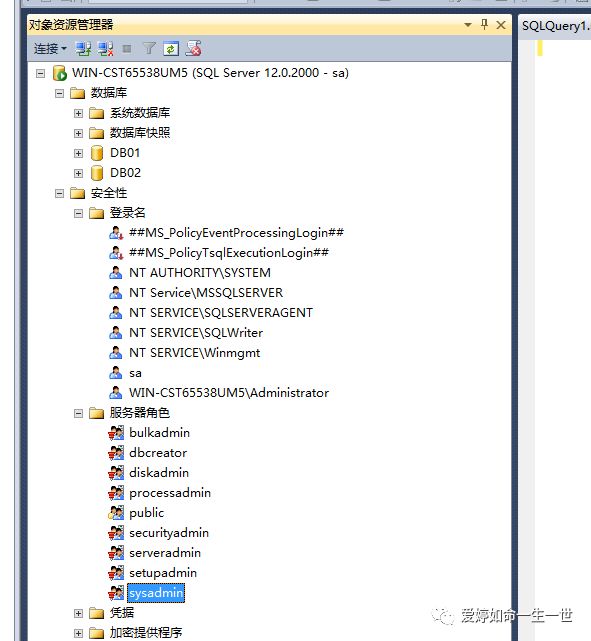 运维人员主要关注登录名和服务器角色,其他角色开发人员用的多一些,这里面的登录名可以按照需求添加,最大的组就是sysadmin组。