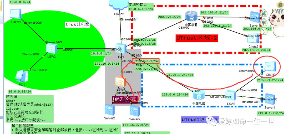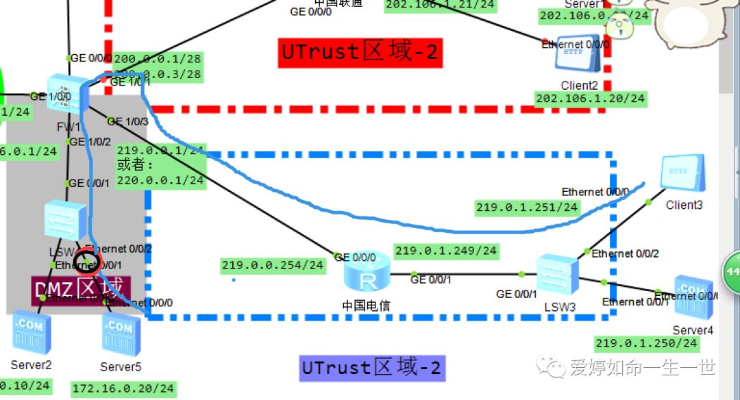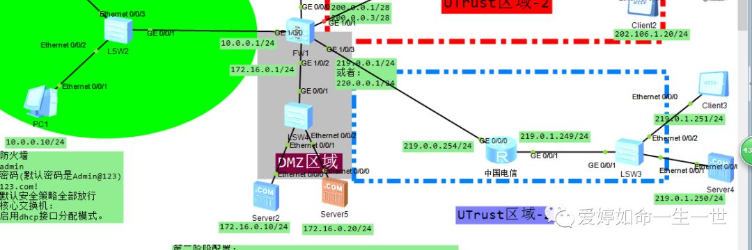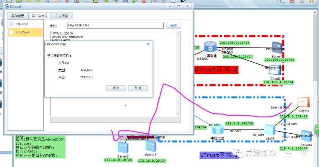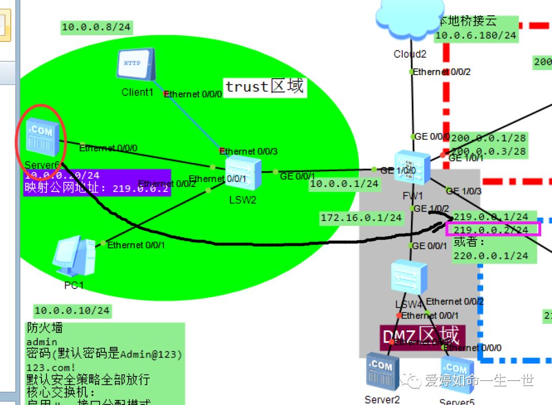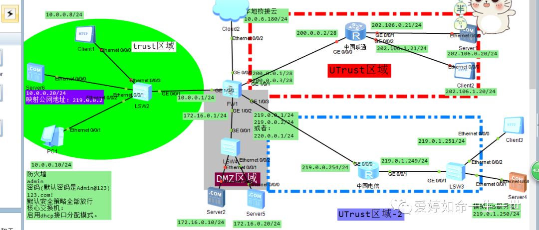 拓扑中防火墙配置默认路由,放行安全策略,添加安全区域,接口地址,模拟web服务等配置上面的实验已做分享,这里略过。