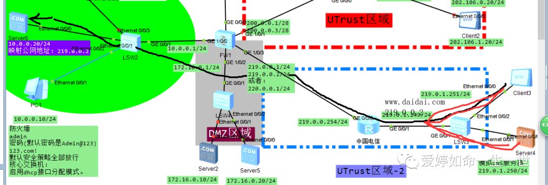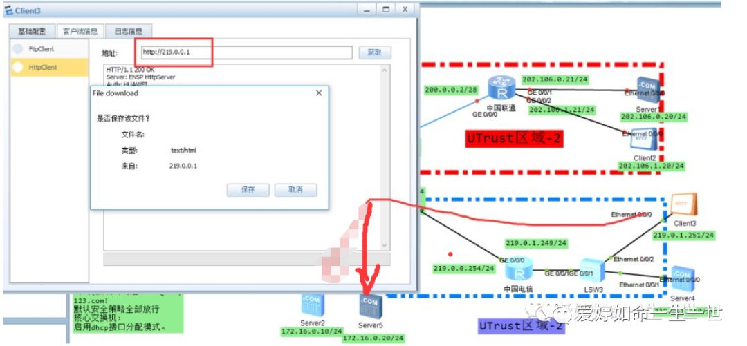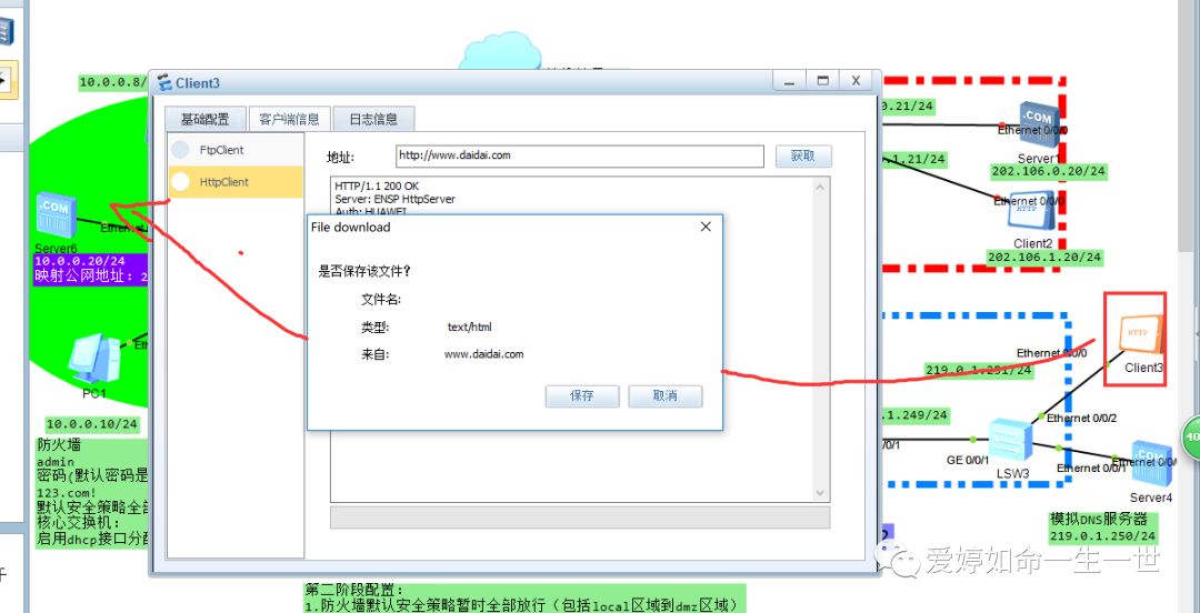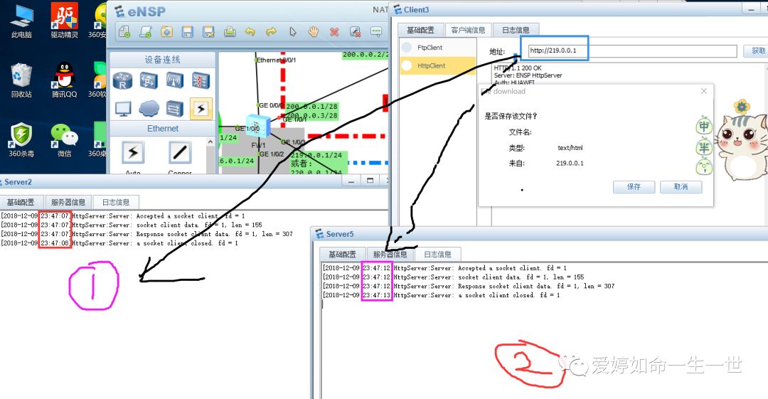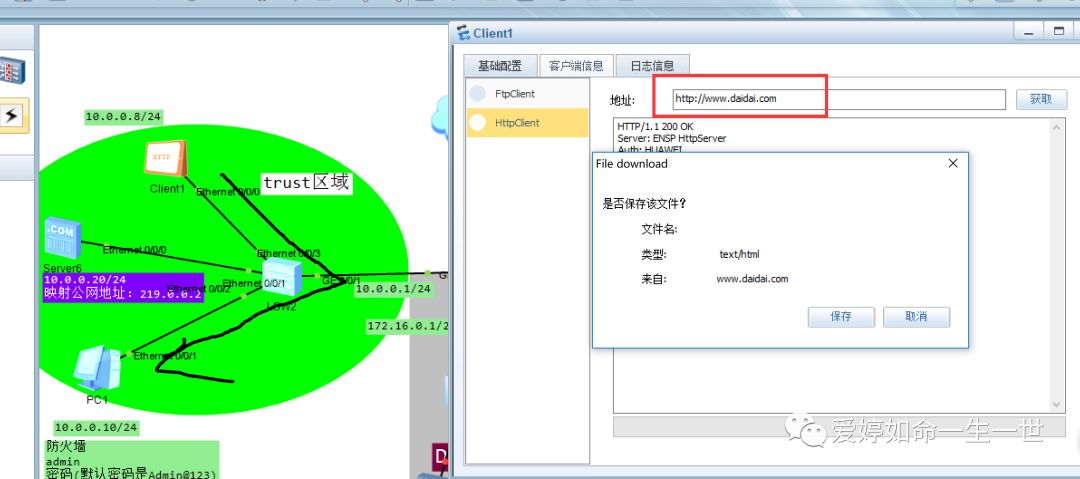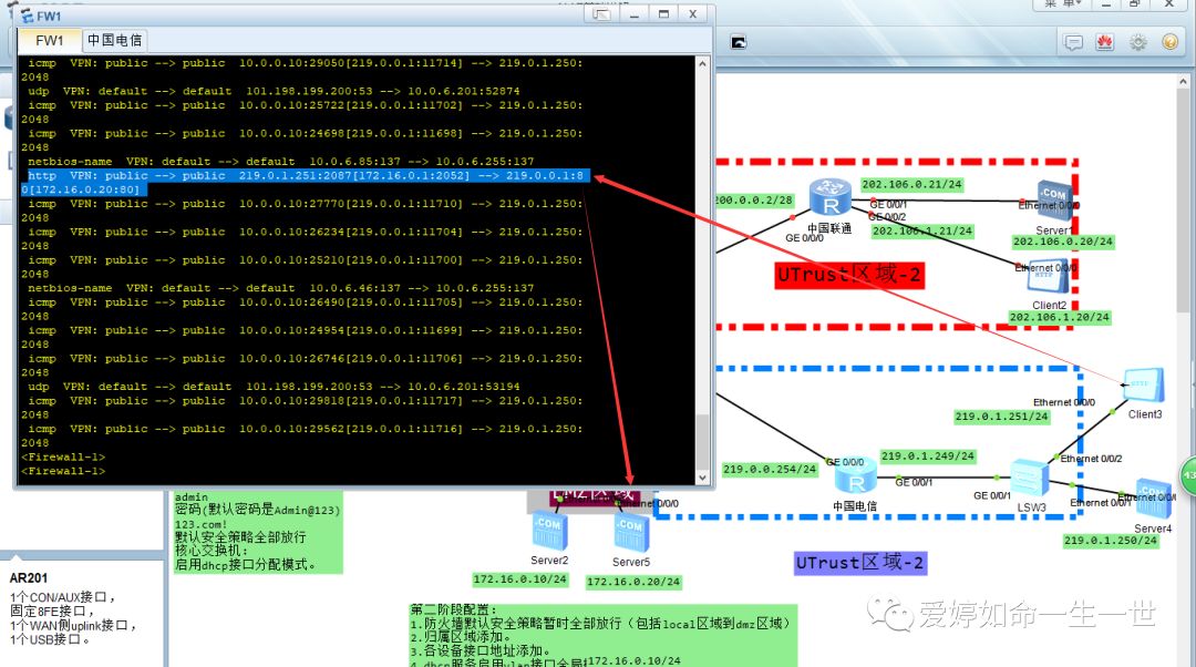 拓扑中防火墙配置默认路由,放行安全策略,添加安全区域,接口地址,模拟web服务等配置上面的实验已做分享,这里略过。