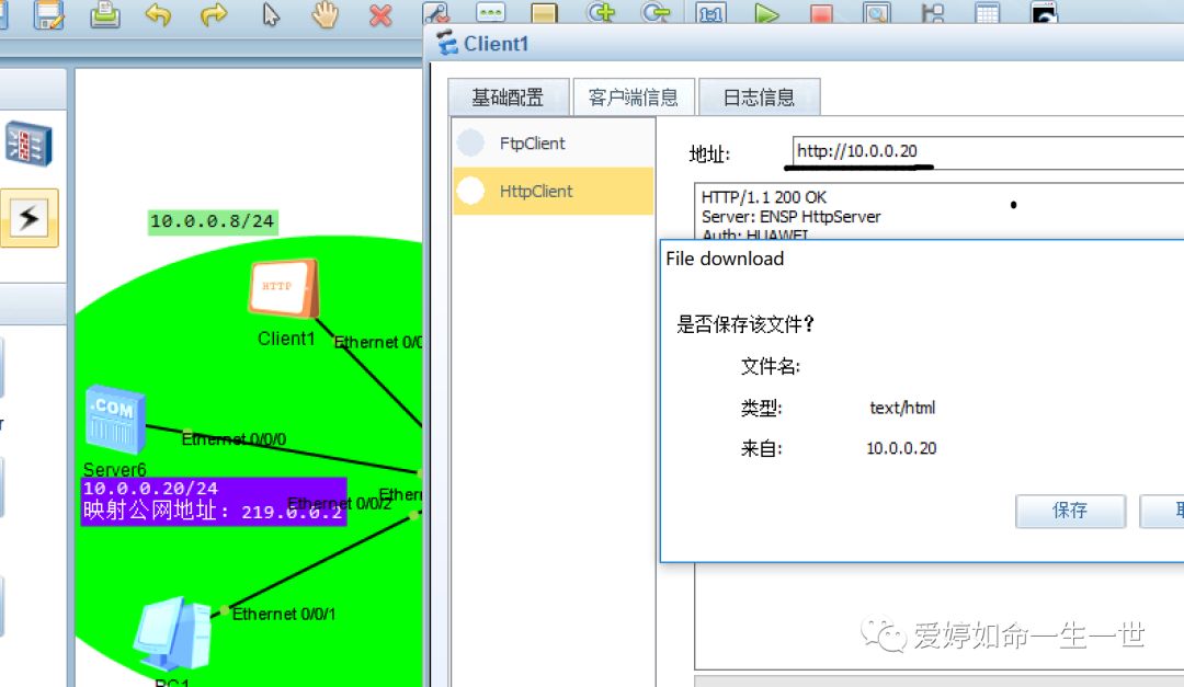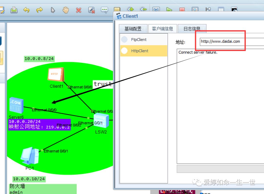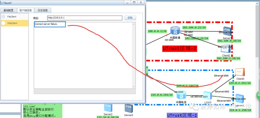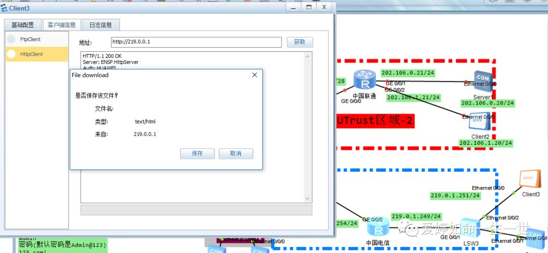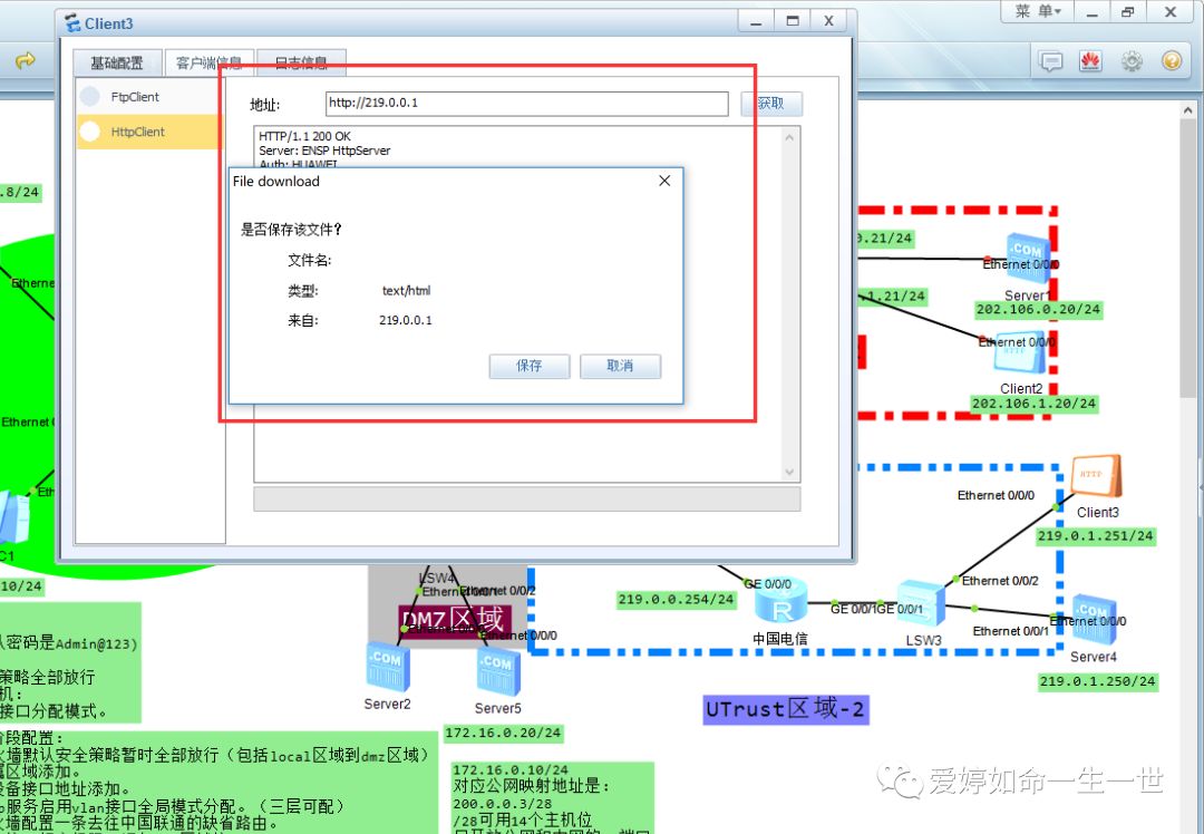 配置完成后,拓扑中的外网客户端输入219.0.0.1来访问DMZ区域的server2