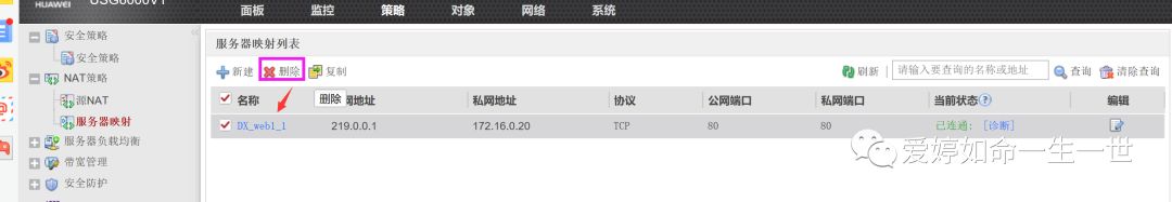 配置NAT-SLB之前,我可以删除之前我配置的一条服务器静态映射策略: