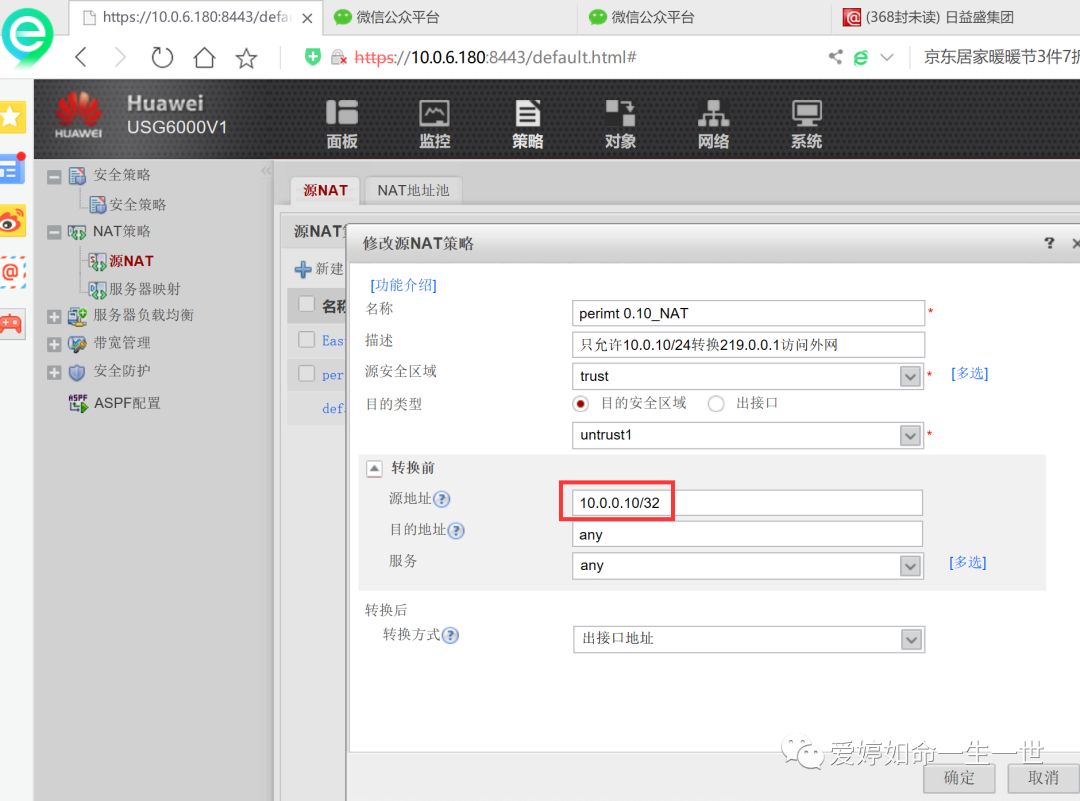 有些企业对特殊部门访问外网有这特殊的限制,我们可以修改源NAT里面的源地址来限制其他网段或者客户端访问外网。