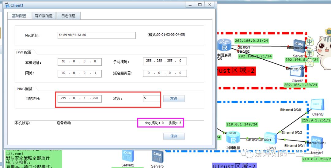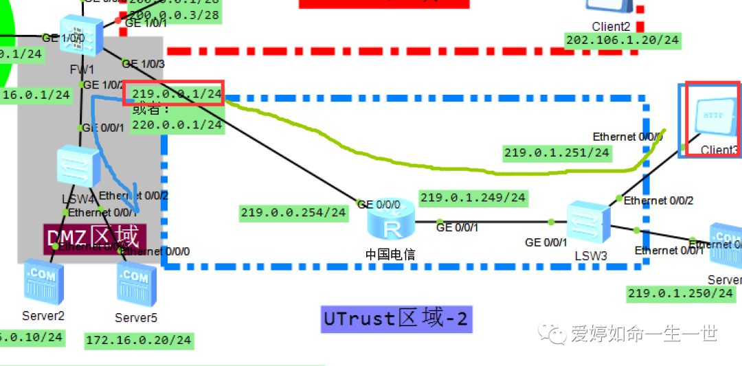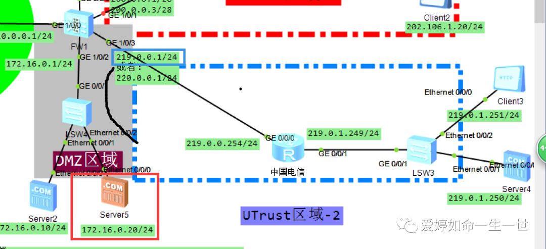 我先将Server5的私网地址,映射给219.0.0.1并且只能让电信这条链路来的客户端访问。